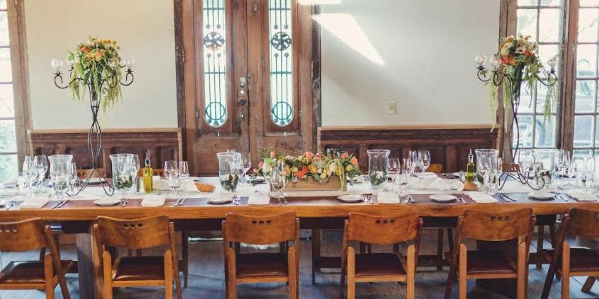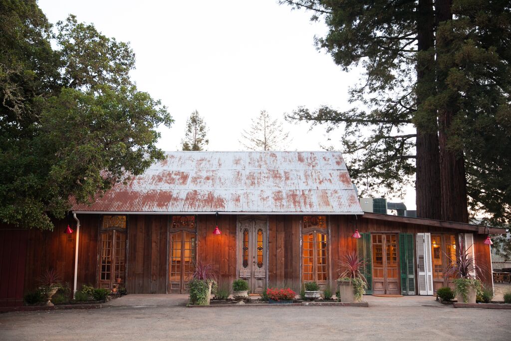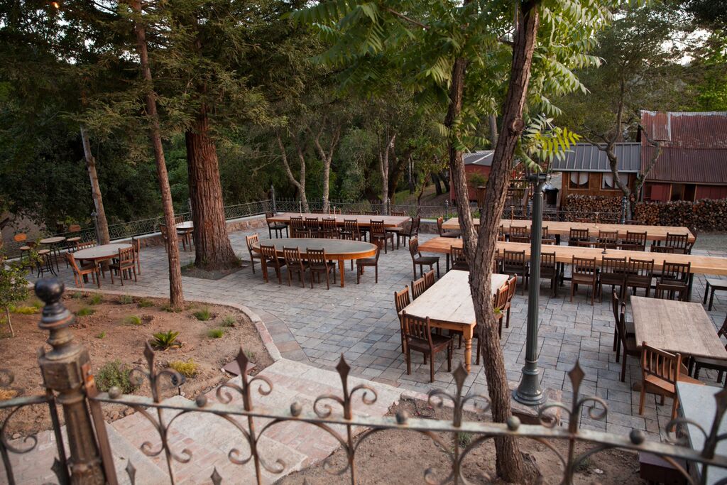 The old dairly barn has been beautifully transformed to be the party/reception/meeting space. Incredible corner fireplace adjacent to the handsome bar and we love the old wood floors… the intricate antique doors are unique and quite the statement maker. To the back is a shaded terraced outdoor dining area.