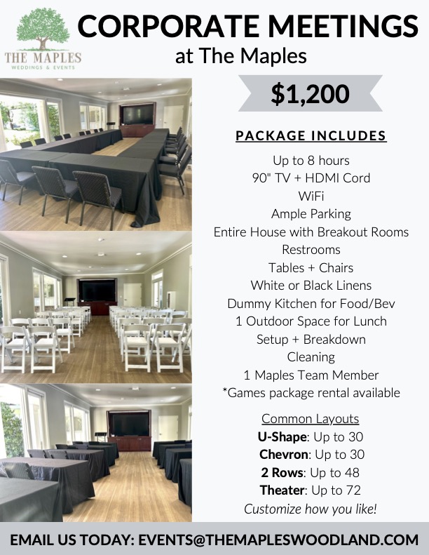 We are often contact by those looking for conference space and want to offer something beyond a traditional hotel. The Maples is a wonderful spot for a wedding or celebration, and they also offer a smaller indoor venue. This room is a great option for a group of up to 72 for corporate, team building, or conferences. There are also many outdoor options for breakouts, lunch, and visiting. Be sure to check it out!