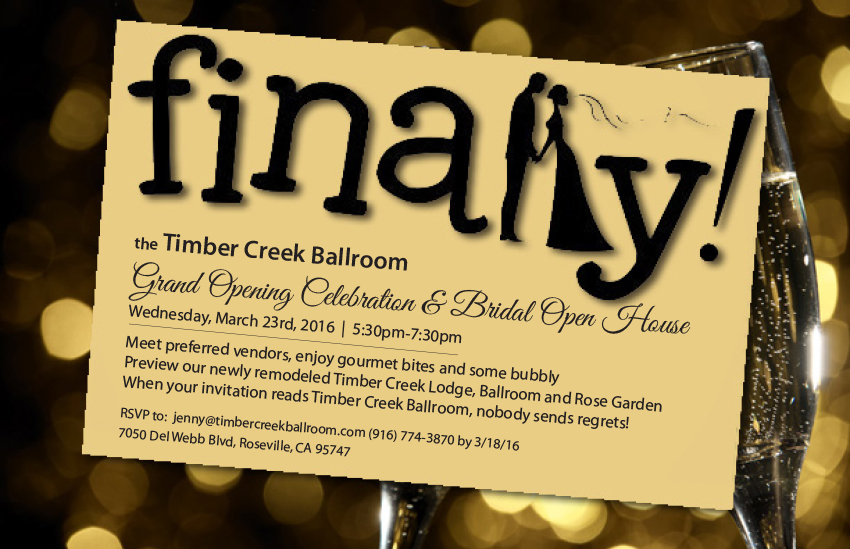 After a number of weeks of painting, laying new carpet, refinishing wood and purchasing brand new furniture, The Timber Creek Ballroom is having a celebration. Mark your calendar for Wednesday, March 23rd to check it out. Enjoy some gourmet bites and champagne… meet helpful and talented vendors and enjoy!