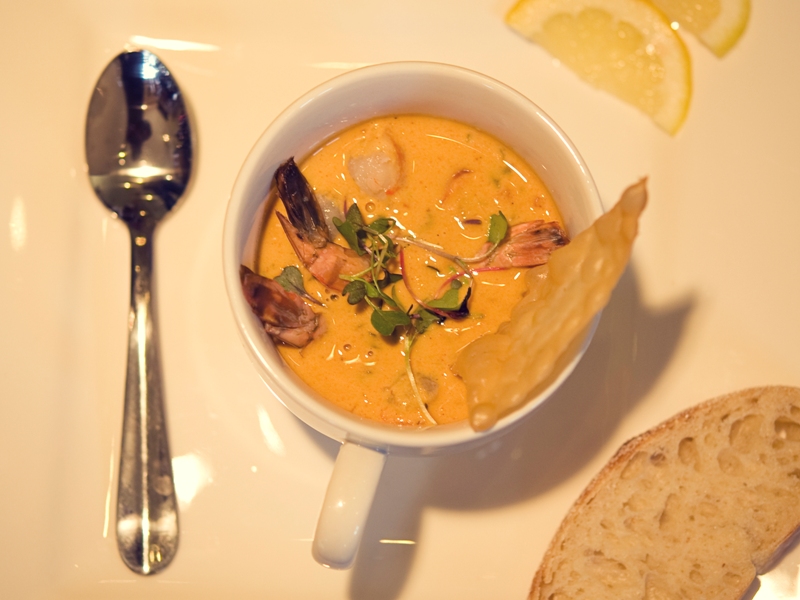 We settled down at our comfortable table and allowed our wonderful friend and fabulous photographer, Beth Baugher of True Love Photo to take photos of all the beautifully created dishes. Great shots! We were served a hot, very delicious Thai Coconut & Curry Shrimp Soup – garnished with mico greens and wonton crisp. It was so pretty.