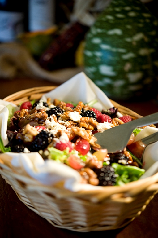 Vintner’s Garden Salad – Organic baby greens, crumbled gorgonzola, glazed walnuts, fresh berries and grapes with blackberry-zinfandel vinaigrette