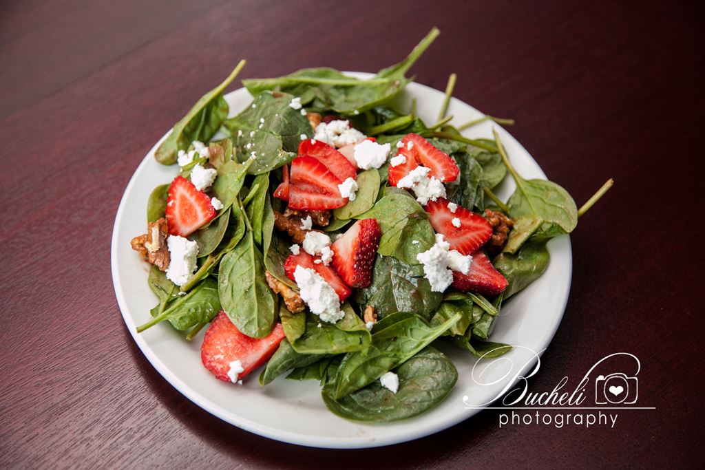 We started off sharing a plate of very fresh Heirloom Tomatoes and Fresh Mozzarella with fresh picked basil from the restaurant’s Kitchen Herb Garden. Then we shared three different salads on the menu: Classically prepared Caesar Salad (very lemon-y), a Young Spinach Salad with sliced strawberries, goat cheese and honeyed walnuts, and a Hearts of Romaine with applewood bacon, crumbled Bleu cheese and balsamic vinaigrette.