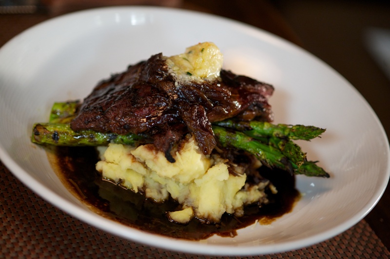 Grilled Skirt Steak – Caramelized onions, blue cheese butter, Parmesan potatoes and asparagus