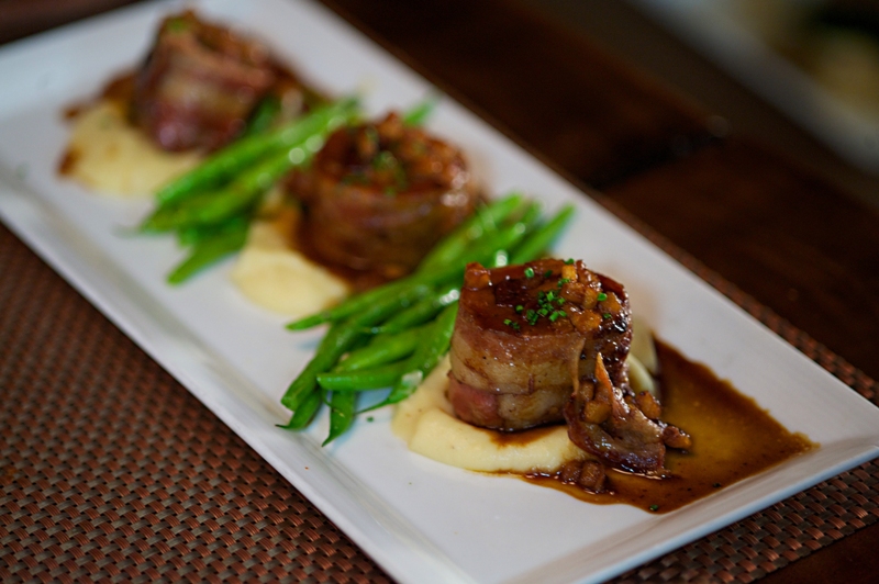Filet Mignon – Loaded mashed potatoes, loaded potato skin, caramelized broccoli and red wine demi glaze (really, really good!).