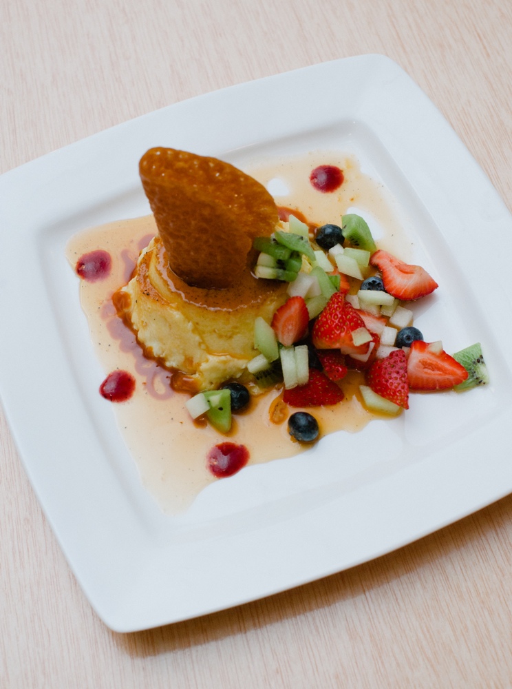 Vanilla Bean Flan with Farmers Market Fruit Salsa and Tuille Cookie