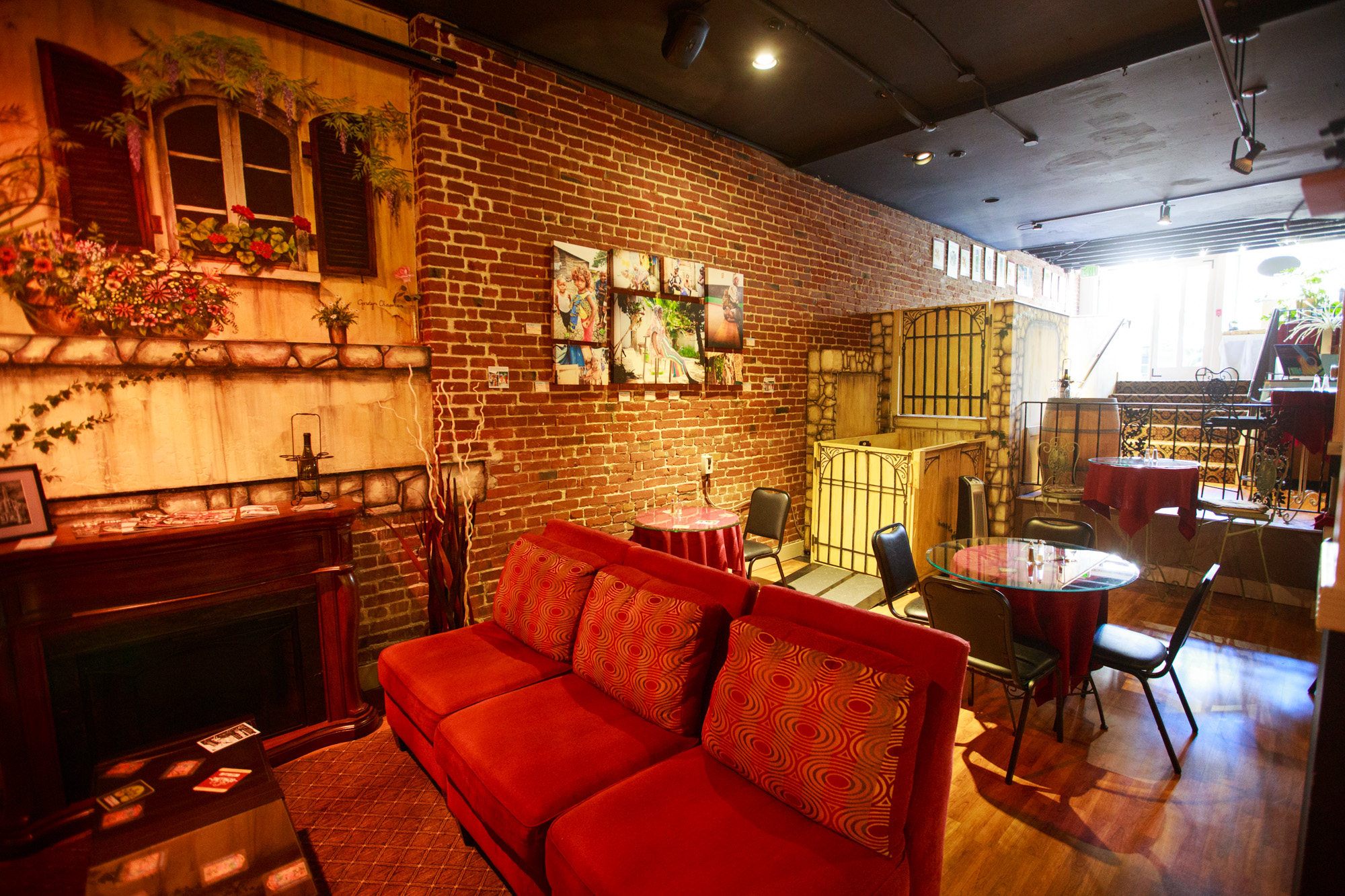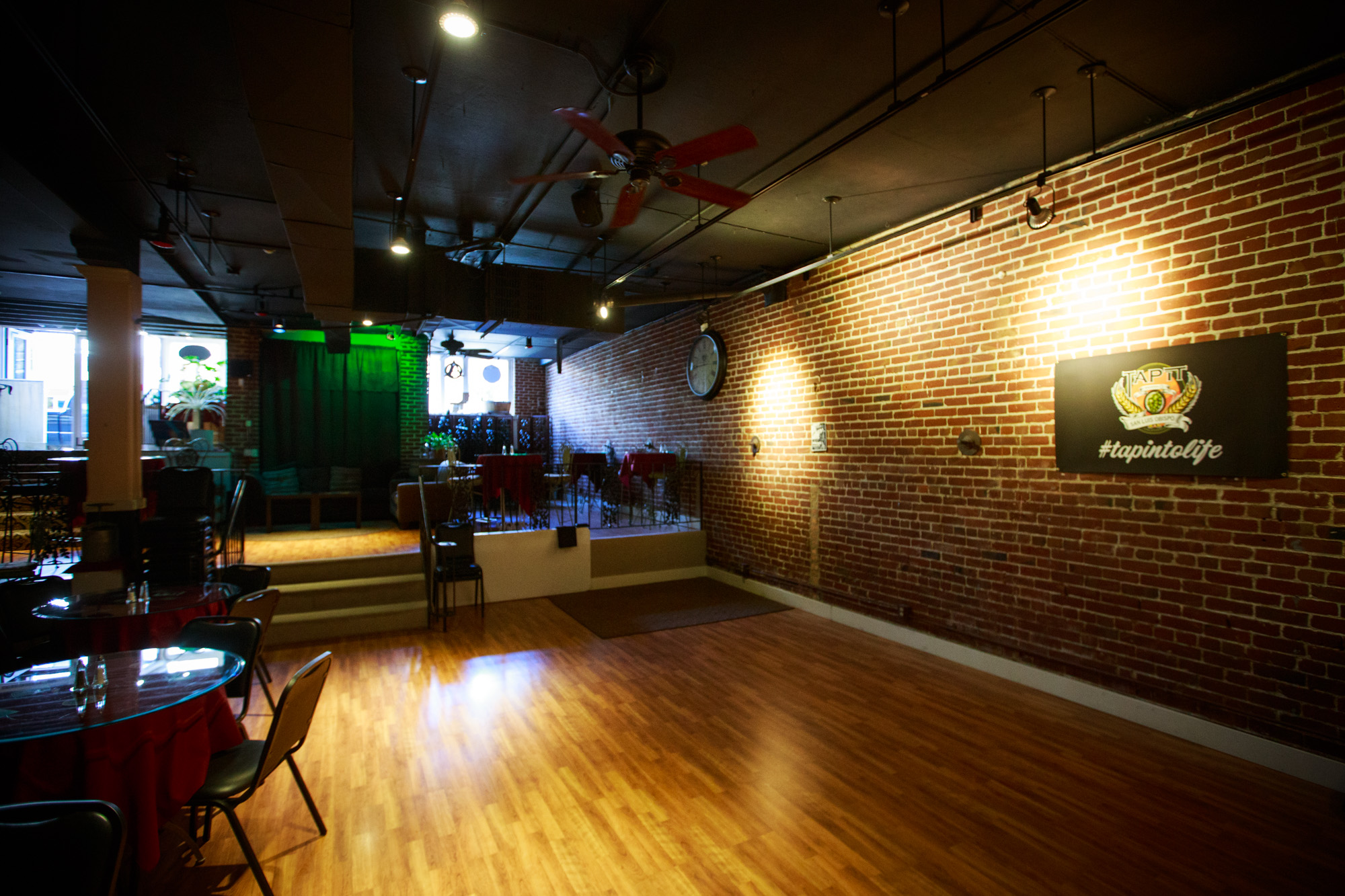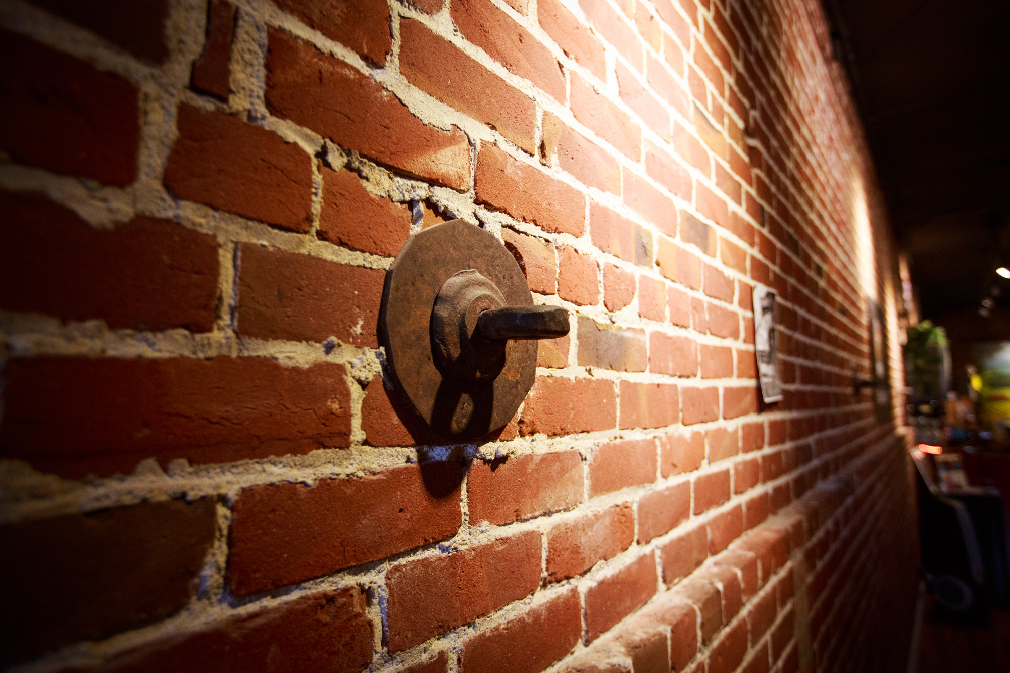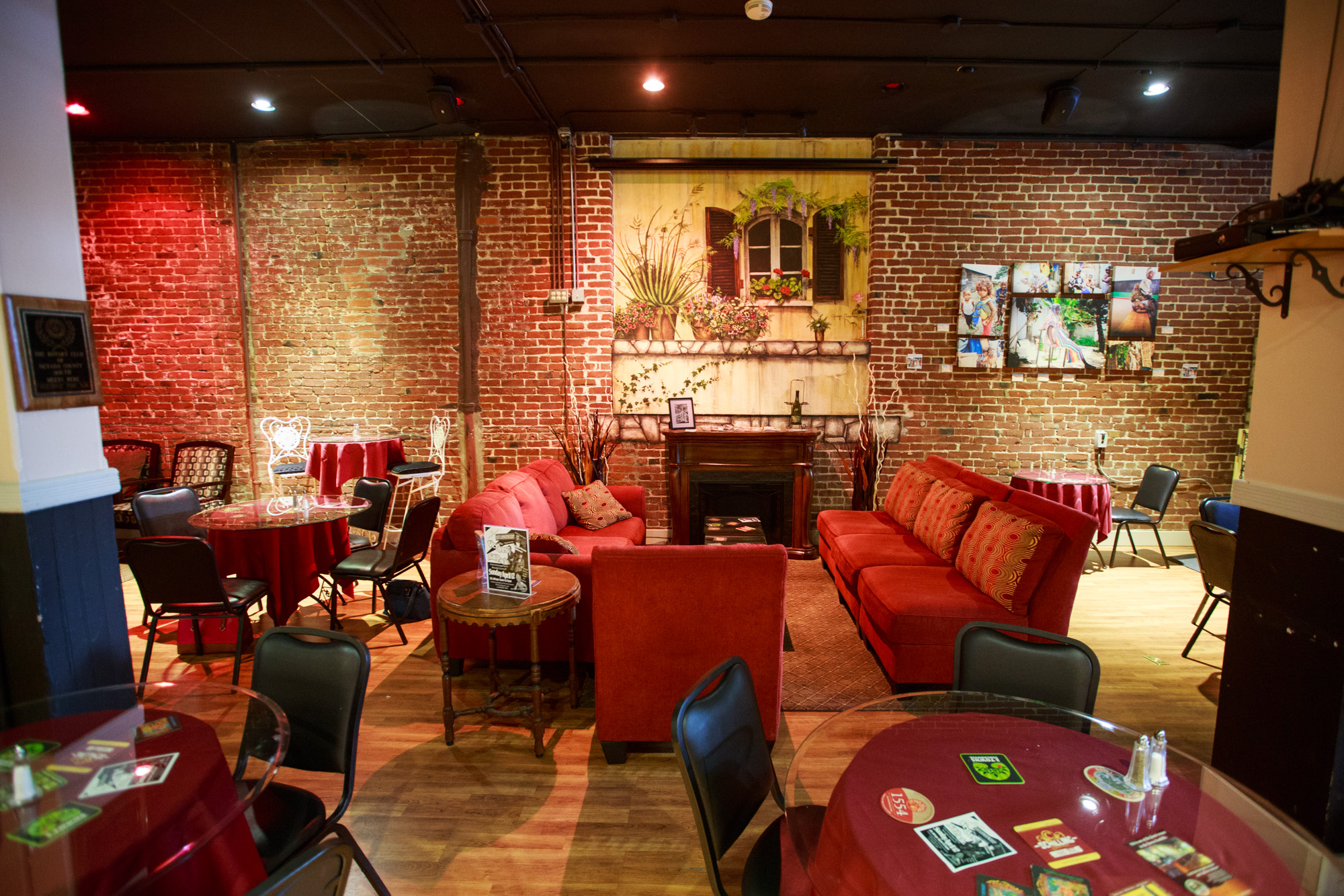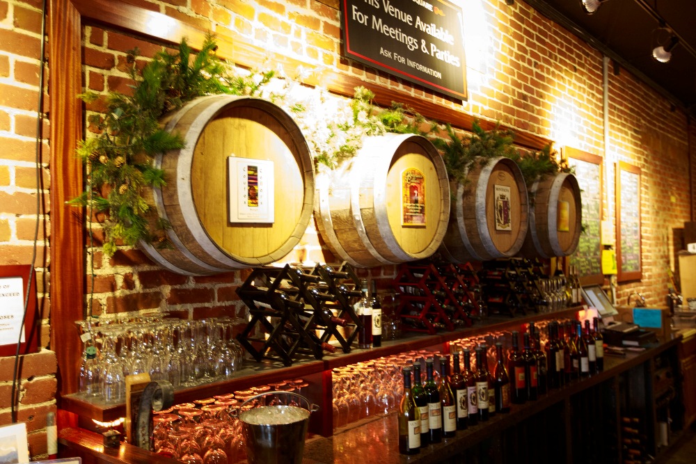 This spacious one room facility offers a tiered entry with multiple levels, a small stage (band, or sweetheart table), and a large bar with stools, half wine barrel bar backdrop and 17 craft beers on tap. The space, in an historic building, has the classic brick side walls, red tear-drop lights over the bar, a fireplace backdrop, black chairs and red suede couches.