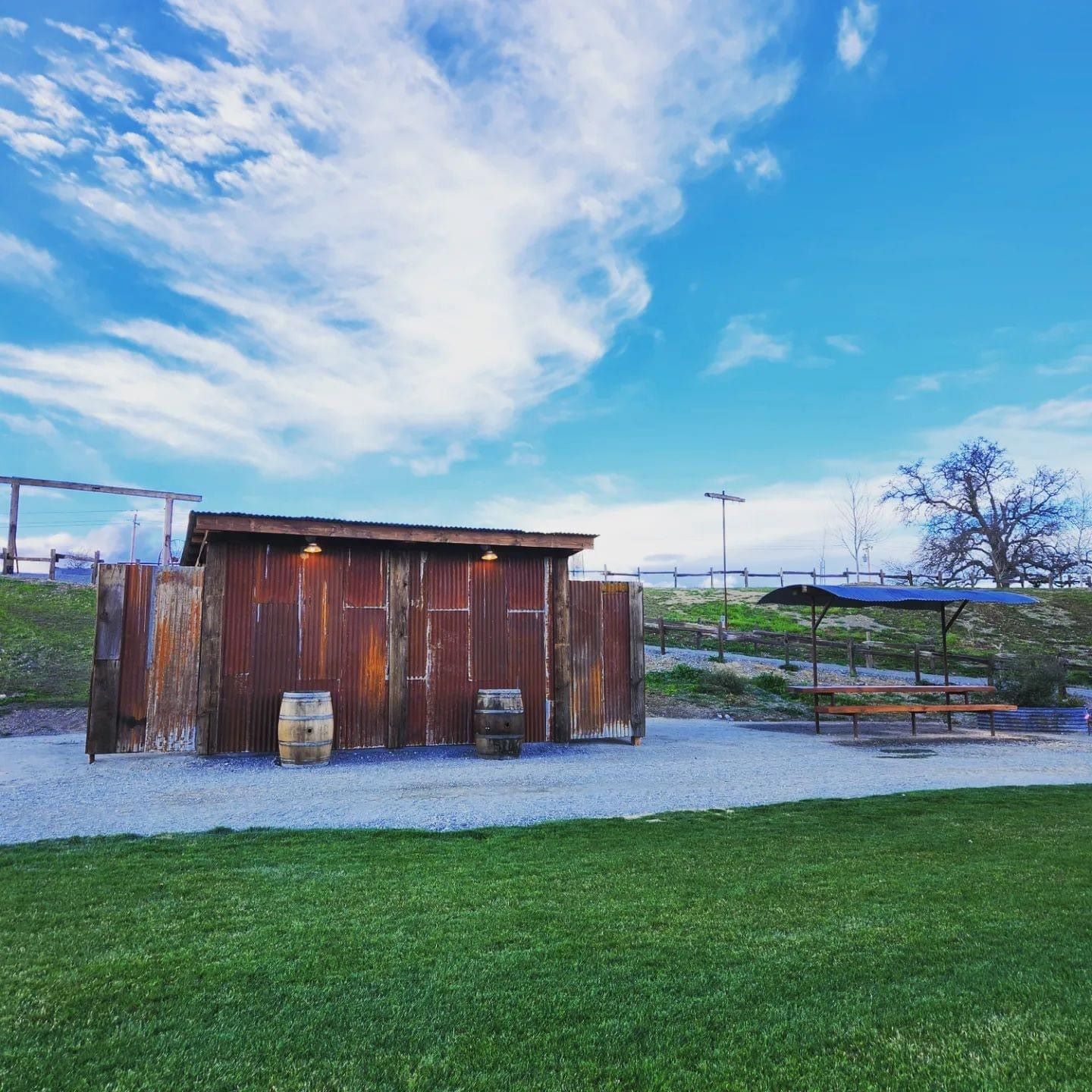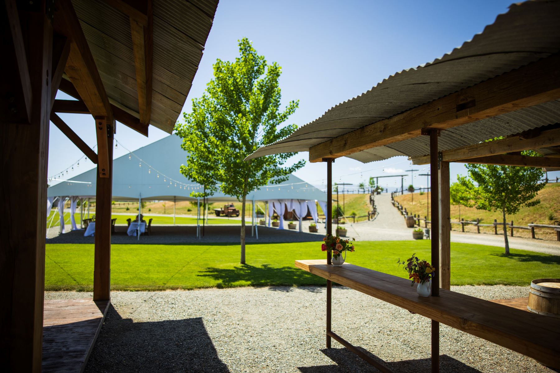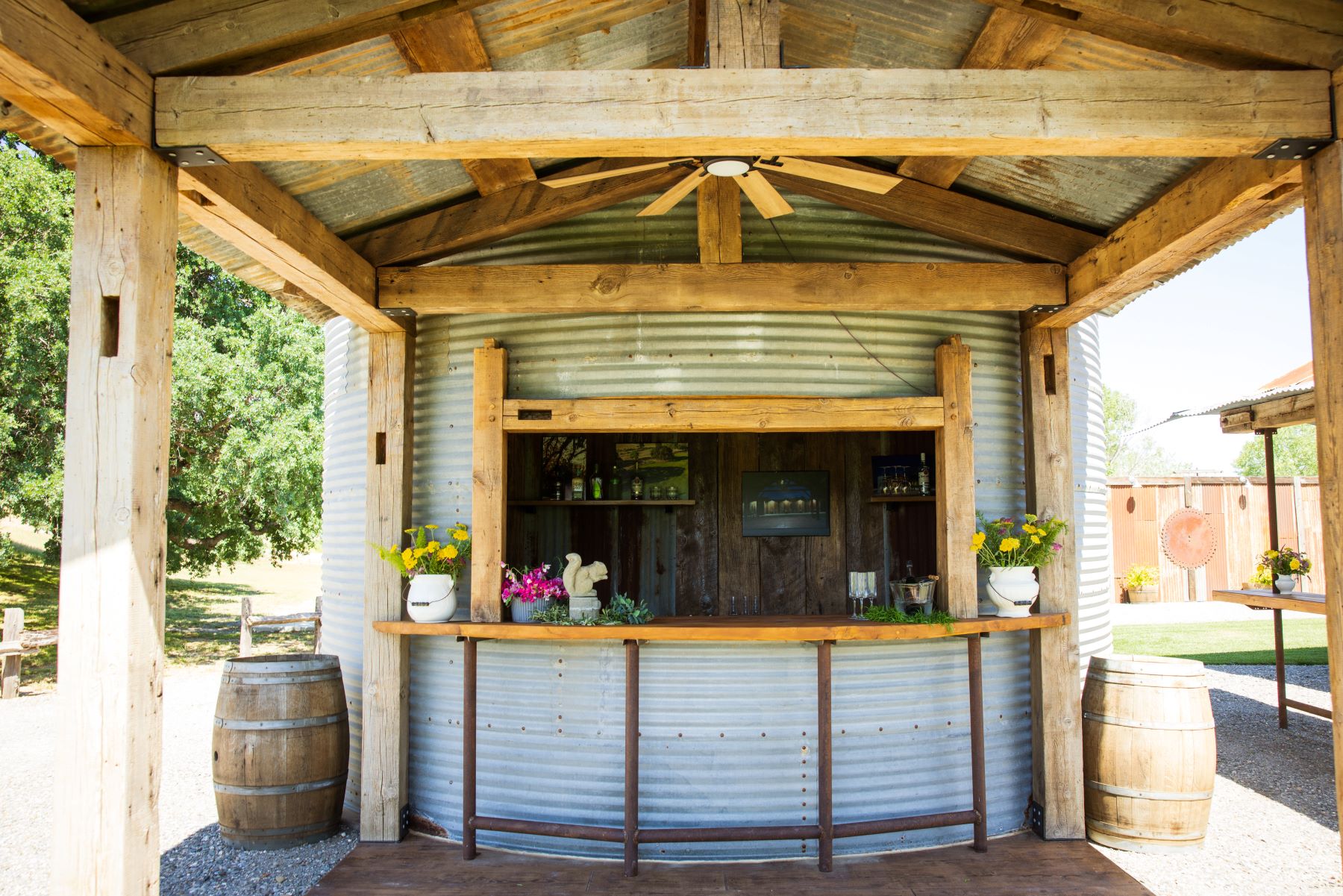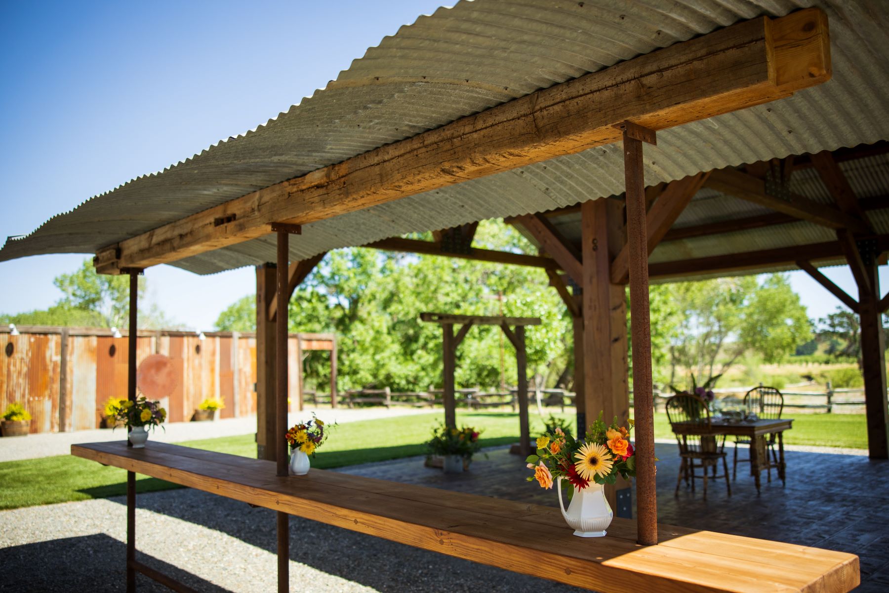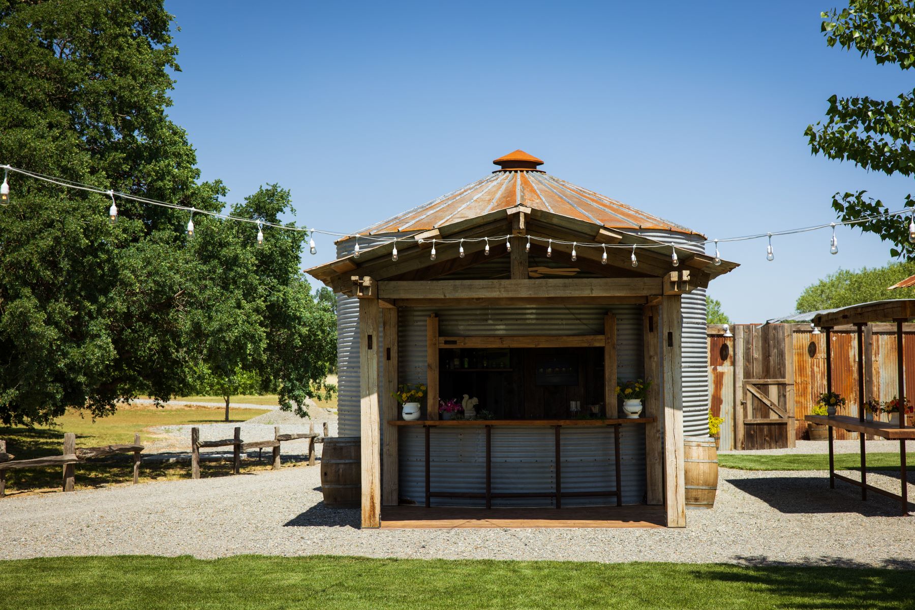 This ranch has been in the family since 1870 (!) and the owners have custom built and designed the structures. From the stand up bars with metal roof tops, to the grain bin bar, the historic post and beam ceremony arbor, and even the awesome restroom building, every thing fits in perfectly with the setting. The craftsmanship to the various structures is outstanding and the guests will appreciate the building workmanship and technique. And notice the outdoor lighting are Edison lights on posts that are reminiscent to telegraph poles. Every detail has been well-thought and purposeful.