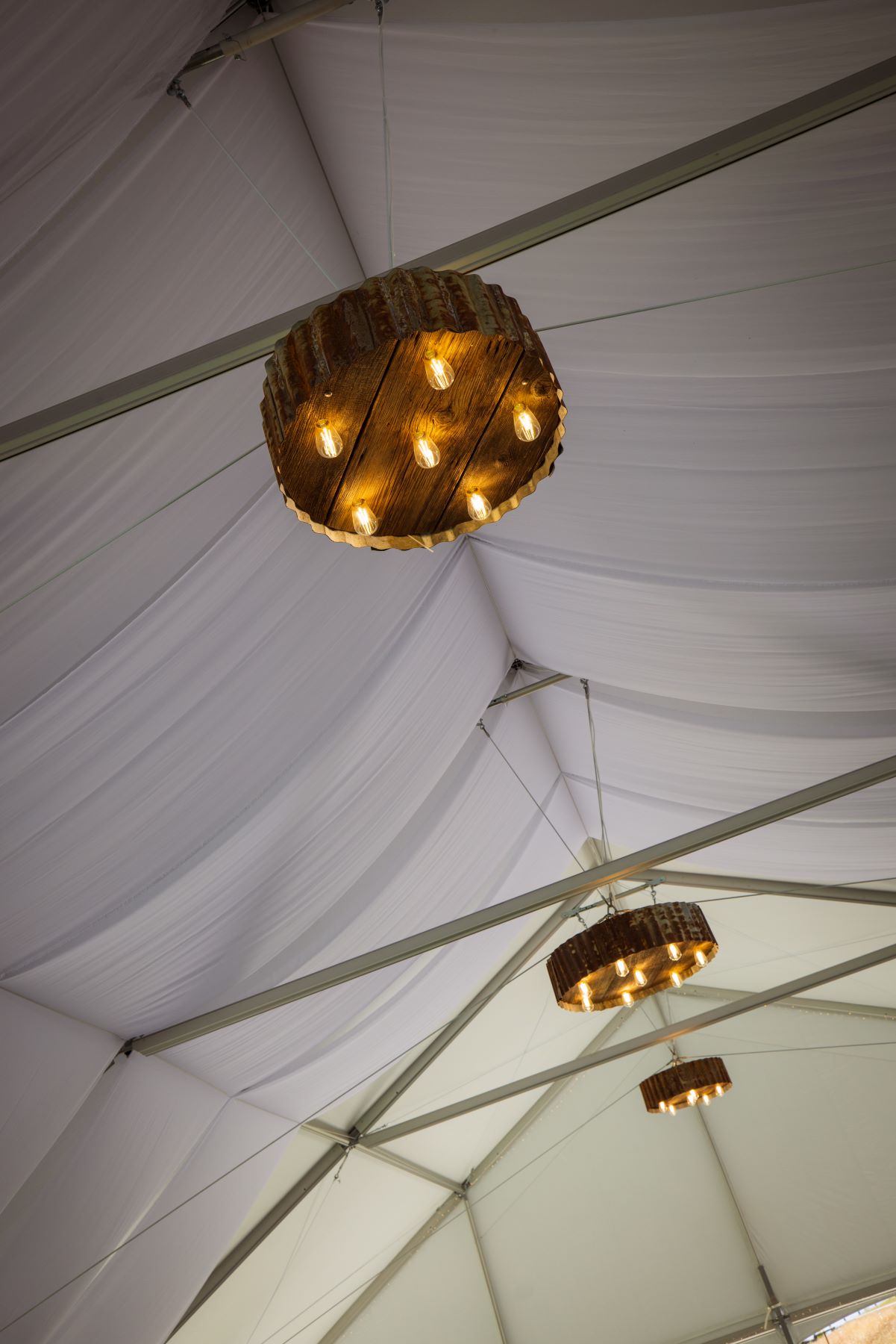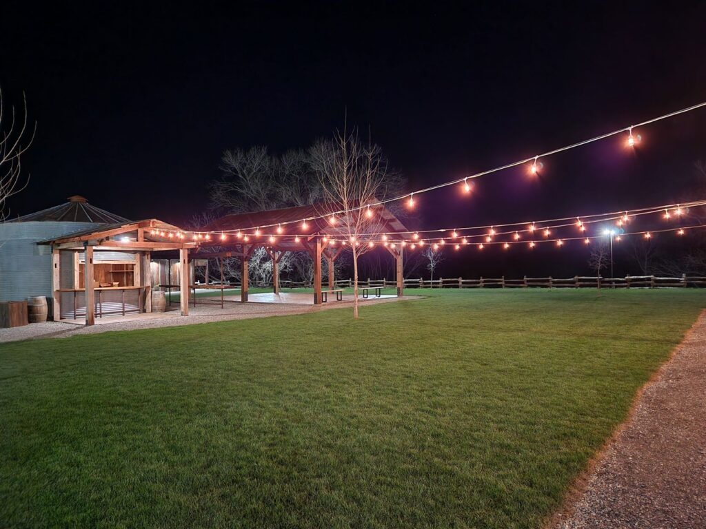A ceremony spot under the native oak trees can be seen along with a gleaming white tent for the reception gathering and dinner. What’s more, the tent has cool decorator light fixtures and the whole tent glows at night! An awesome grain bin bar with adjacent dancefloor under the post and beam pavilion is ready for a dance party.