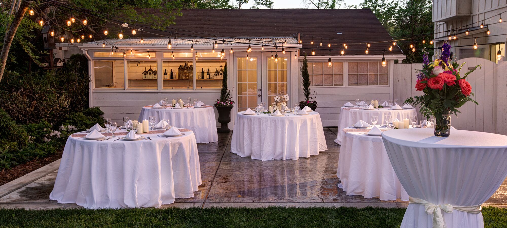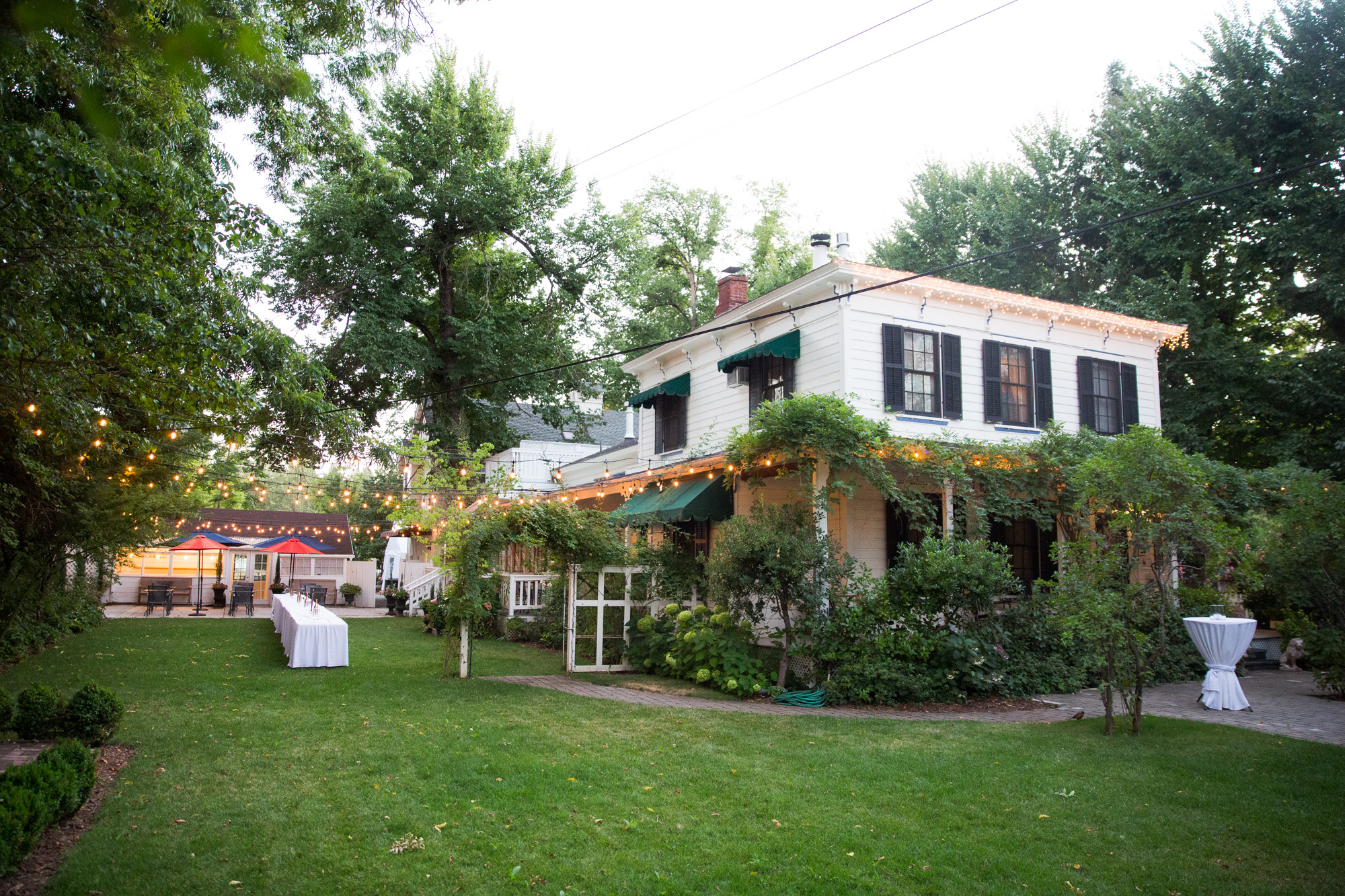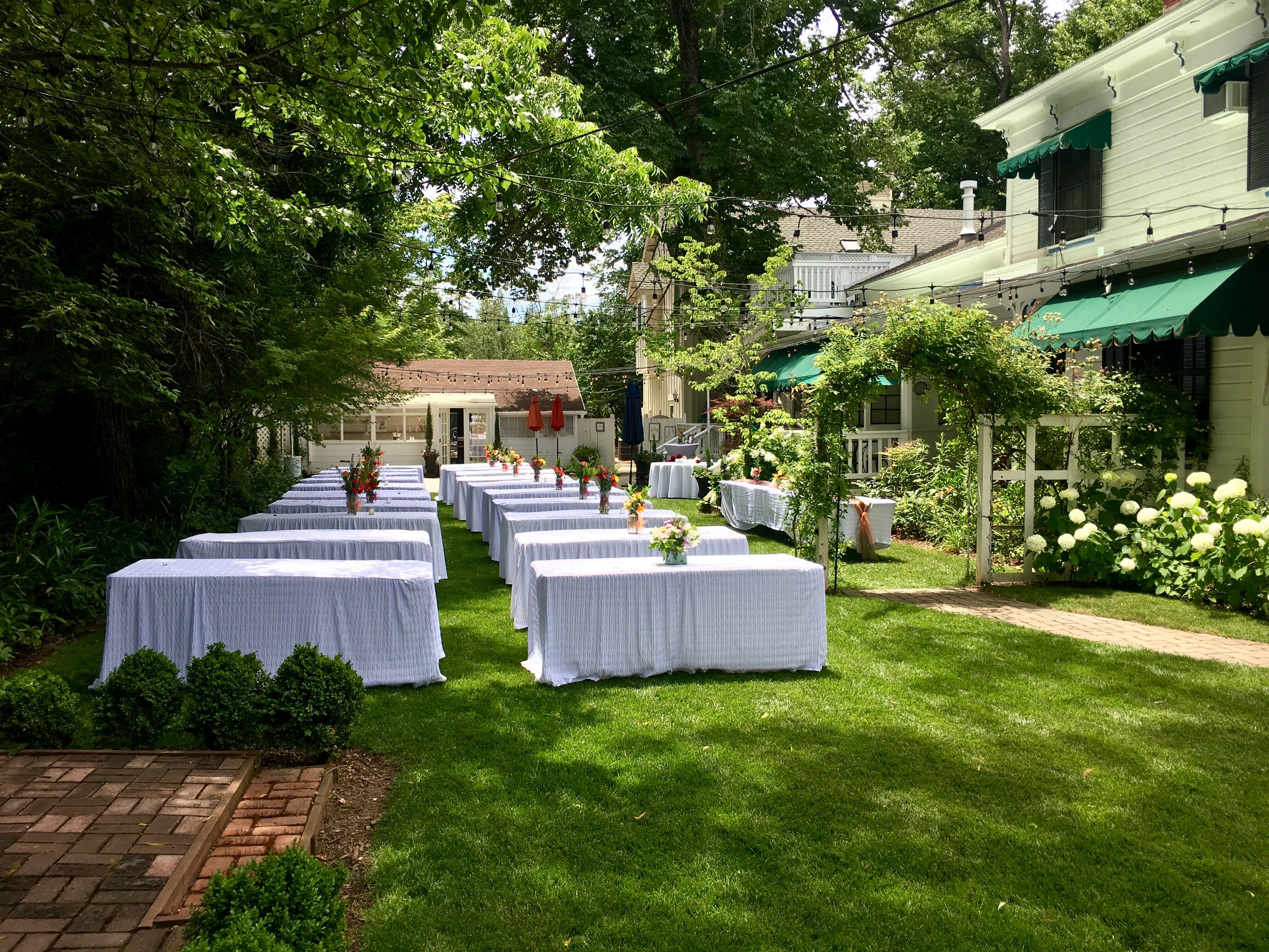 Several areas on the Dunbar House property are perfect to set up special events. You can pick your spot based on the time of day or have a progressive event that uses all of the fantastic options. Weddings are ideal for Dunbar House as romance is a definite vibe. Corporate meetings or retreats also work very well. The Italian market lights that run across the open lawns are beautiful at night and the gardens surrounding the house are abundant, so minimal table décor is needed. To the side of the property is the “Green House,” a sweet white structure with a cobblestone patio in front, as well as French doors, white open ceiling beams, and paned windows. While being great for the bar, the interior can be used as a meeting room, or for a fun dance party; even as a rehearsal dinner location or Sunday brunch venue – there are many options and convenience and flexibility is important to the staff at Dunbar House. Adjacent to the Green House is an outdoor sitting area with a fire pit and space designed for a gleaming white tent complete with flooring and lighting (20×50′ tent is available for a separate reasonable fee.) To simplify your planning all of the tables, chairs, china and linen are included in the facility rental and catering can be selected from a small list of preferred caterers. They have structured the packages to be as inclusive and streamlined as possible.