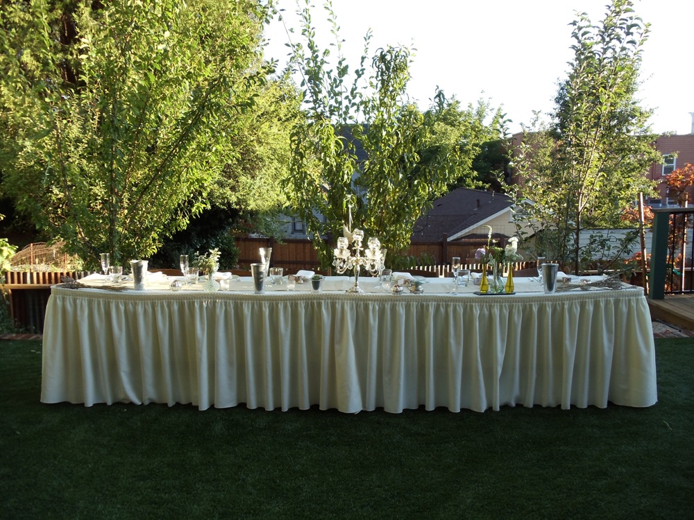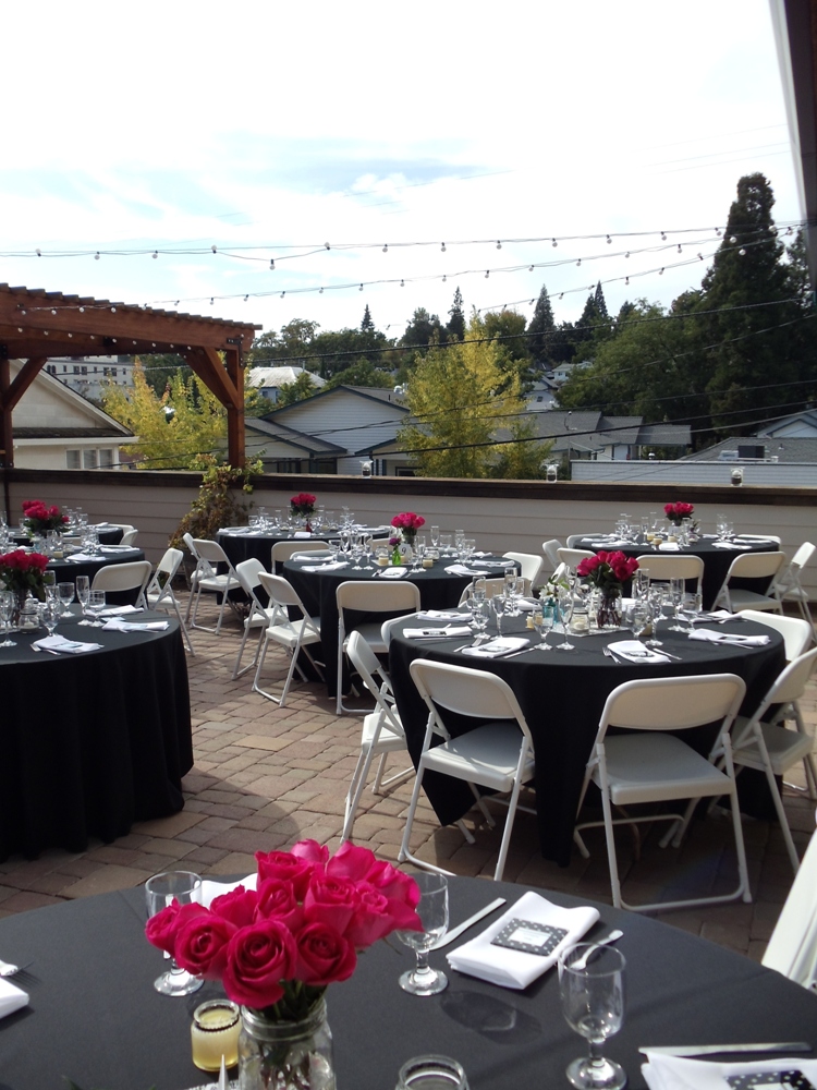 We struck it rich during our visits to the Gold Country. In the small town of Grass Valley, CA, rich with history, we had the opportunity to experience the hospitality of the Grass Valley Courtyard Suites…and were pleasantly surprised by the event venues spaces that they offer. Directly across the street from the Courtyard Suites main hotel area (which includes 36 guest rooms), is a unique property that houses the fitness center and event spaces. With one guest room (and more to come!) the building structure built in the last 1800’s, has original rock walls and lovely landscaping. With hotel rooms, lawn and gardens, plus the choice of interior space or rooftop space, everything can be on-location and it’s perfect for 100 guests. Hidden behind the building is the private, terraced Garden Lawn surrounded by blooming florals and shaded by a giant pine tree. Flower beds within a natural rock retaining wall and potted plants surround the area and glow into the evening from the twinkling perimeter lights. This is a lovely spot for a wedding ceremony, and can also be used as a dining area.