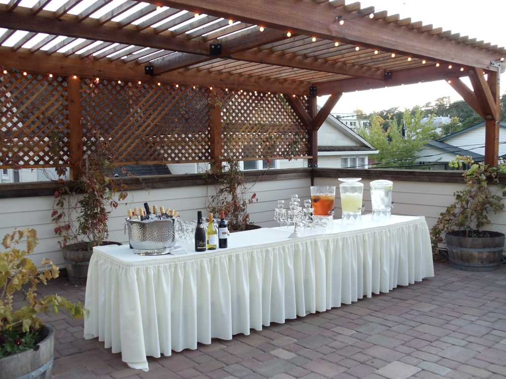 Adjacent to the Garden Lawn is the Garden Patio, actually a rooftop patio overlooking this quaint old town, with Main Street only 2 blocks away. The roof top patio also has the festive perimeter lights and the patio includes a natural latticed covering with Virginia Creeper and grape vines softening the structure. The rental of this space includes tables, chairs and some market umbrellas, and is truly a canvas in which you can create the wedding or celebration dinner you envision. The Garden Patio can be used as a dining space or if you have dinner on the lawn it will work nicely for cocktails and dancing under the market lights – into the evening!