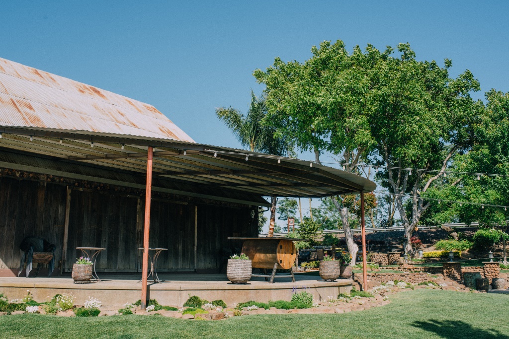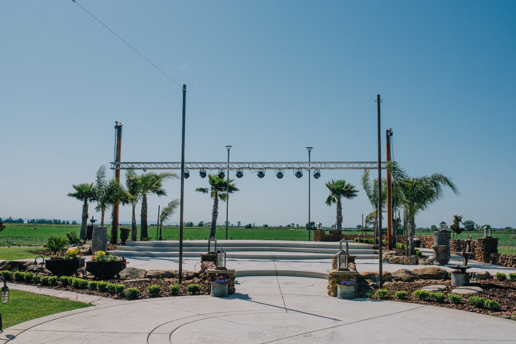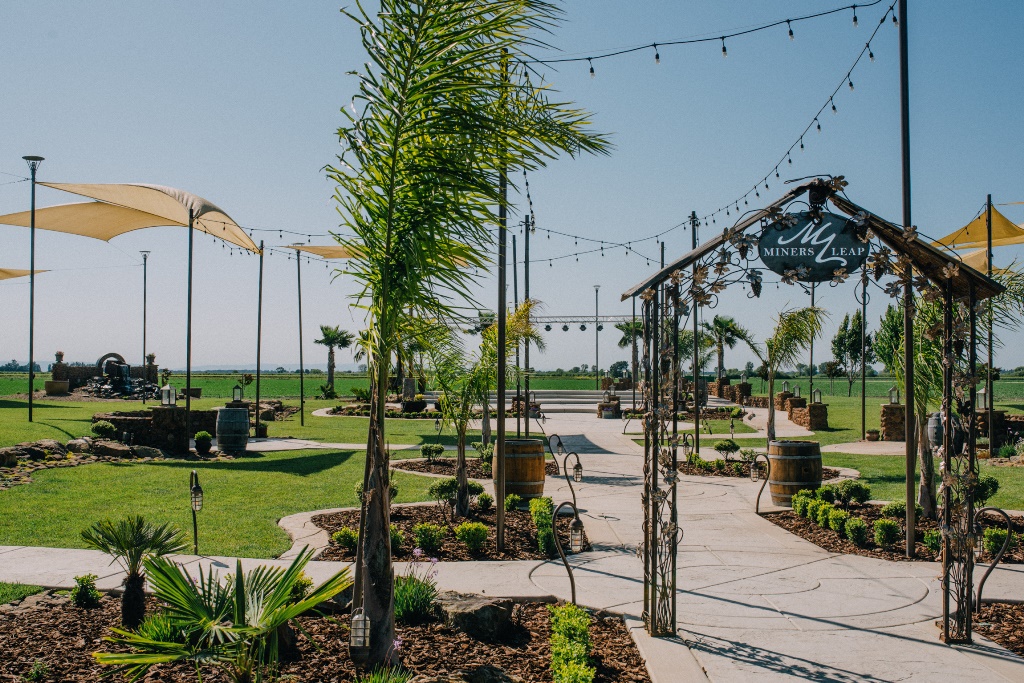 Miner’s Leap Winery is a wonderful 26-acre wedding and music venue “park” located along the Sacramento River only about 15 minutes from downtown Sacramento. We reference “park” because this property is so well manicured, it will make you envious and want to immediately start working on your own home gardening projects! Adjacent to the lawns and gardens is the awesome Miner’s Leap Barn, which is a historic building, approximately 115 years old and once was a livestock barn. You’d sure never know it now as it is beautifully decorated and set up as a well-appointed winery tasting room. With polished cement floors and a handsome rustic chandelier, the barn doors roll back on two sides for views West to the coastal range or out to a landing (almost like a stage) which overlooks the gardens. Within the Barn gardens is a sweet hidden rose garden which could be perfect for an intimate wedding ceremony for about 25 guests. The main gardens are multi-leveled with patio seating, open lawns surrounded by stone walls or rock flower beds and can be used for a larger wedding ceremony and reception of about 100 guests. Placed around the gardens and barn are fun antique artifacts and metal works made by local Clarksburg artists that add visual interest. Miner’s Leap Winery even has some lawn games such as corn hole, kerplunk, tic-tack-toe or Yardtzee for your guests’ amusement. The barn landing and the gardens are perfect for an outdoor cocktail party, birthday gathering, shower, retirement dinner or lovely wedding ceremony and reception.