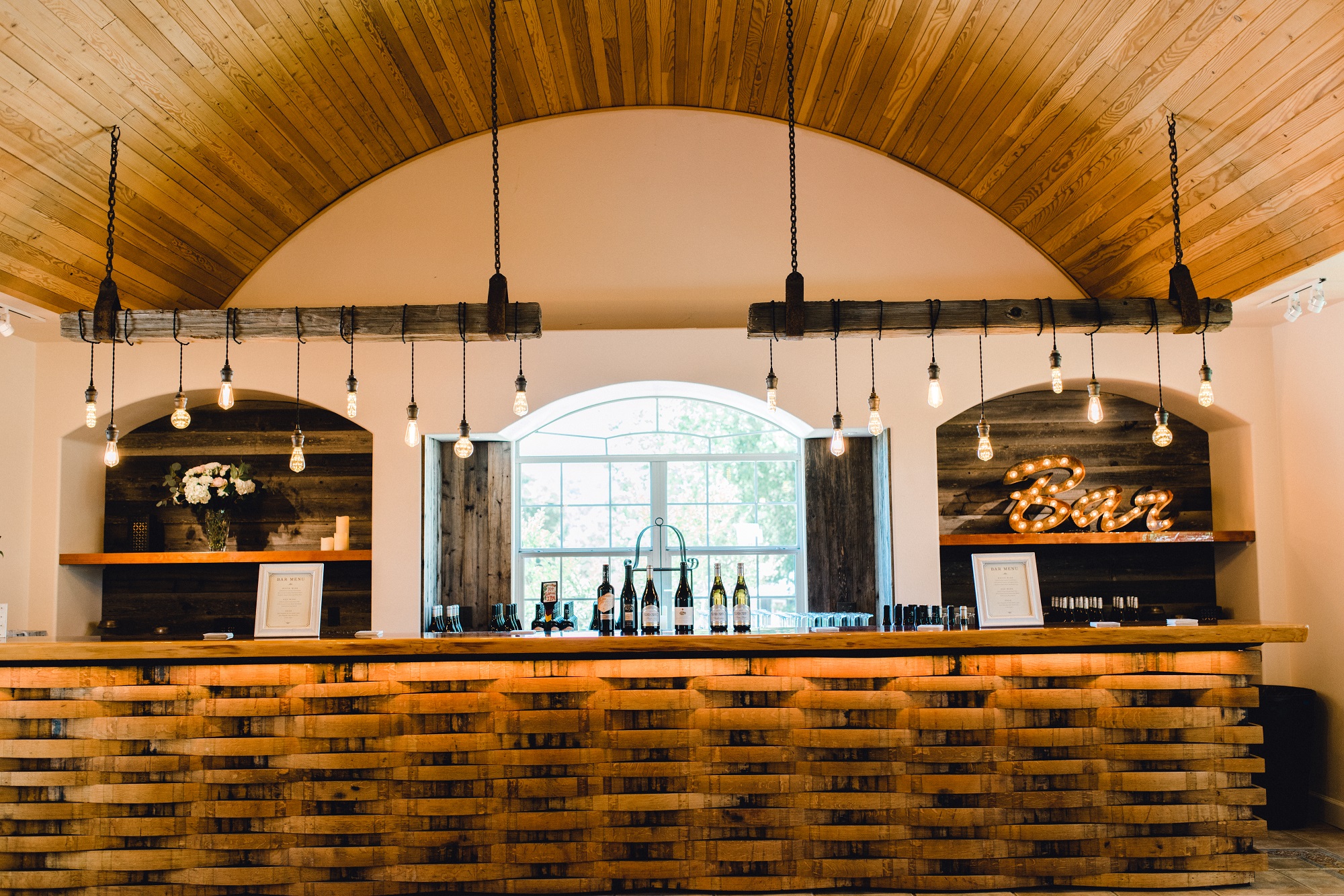 Bring dinner or dancing inside the Great Room and find any excuse to use this fantastic bar area! The Great Room has great natural lighting with abundant windows and glass doors, crown molding, unique oversized hanging lanterns centered from the ceiling, and two parallel alcoves that offer special placement of important details for your event. Attached to this space is the bar of all bars. With a coved rounded wood paneled ceiling, artistic wine barrel paneled bar front, hand-crafted wood beam vintage lighting, tile flooring and wood paneled alcoves to display your bar offerings, this bar will dictate your use of all of the spaces just to tie this room into the mix of the perfect event you are hosting.