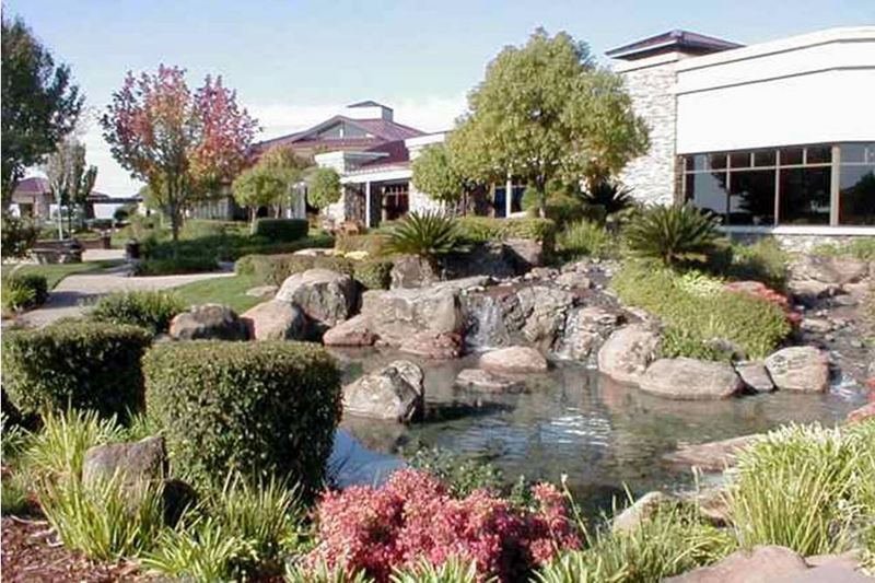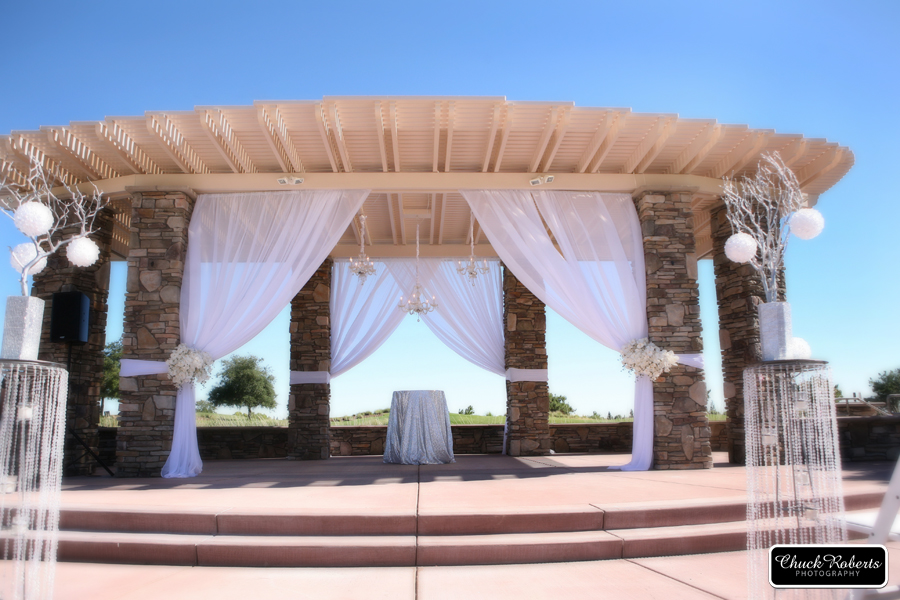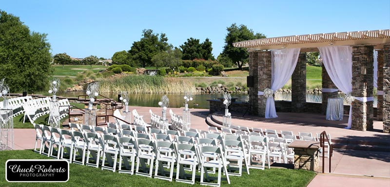 Orchard Creek Lodge at Sun City is a hidden gem. Tucked away in Lincoln Hills is this popular retirement community which boasted a lovely wedding and event venue. The outdoor amphitheater has recently been renovated with a fabulous wood and stone pergola structure. The natural stone is very compatible with its surroundings and makes for a perfect backdrop for a wedding ceremony. Behind the structure is a lovely water feature, a pond with cascading waterfalls and fountains and the rolling green golf course beyond. The bride will have the walk of dreams down the winding path to the altar. The grass is setup as an amphitheater, on levels, so everyone has a great view.