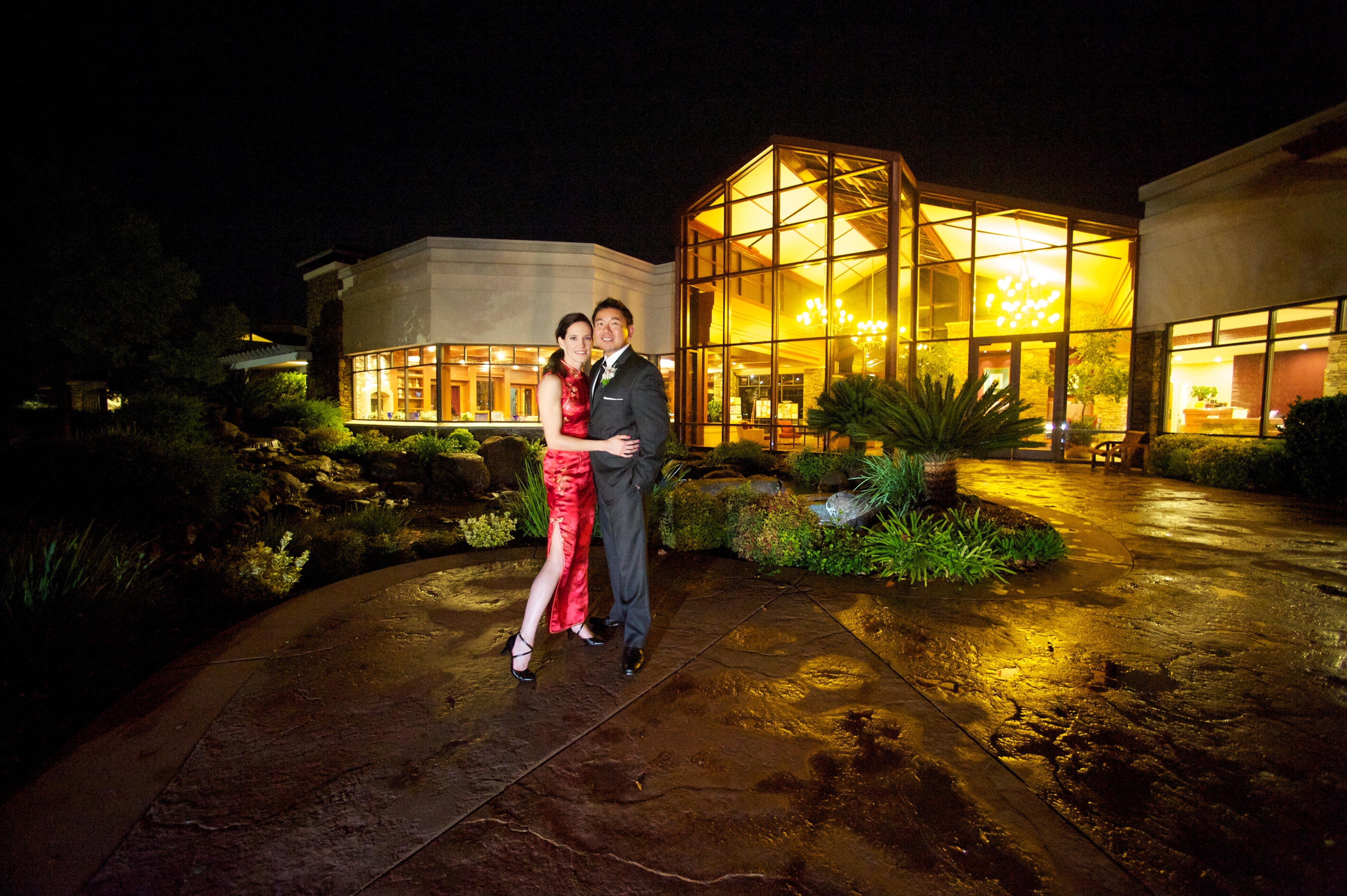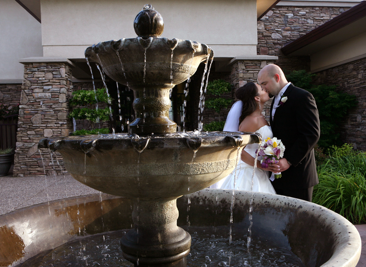 After the ceremony the guests make their way back up the pathway to cocktail on a wonderful patio, with another water feature of a frolicking stream and lush, beautiful gardens with many scented blooming roses – or they can enter the club to continue the party in the foyer with beautiful floor to ceiling windows. Either of these locations can be setup with a bar. The foyer has comfortable couches and a grand piano that can be utilized for no additional cost.