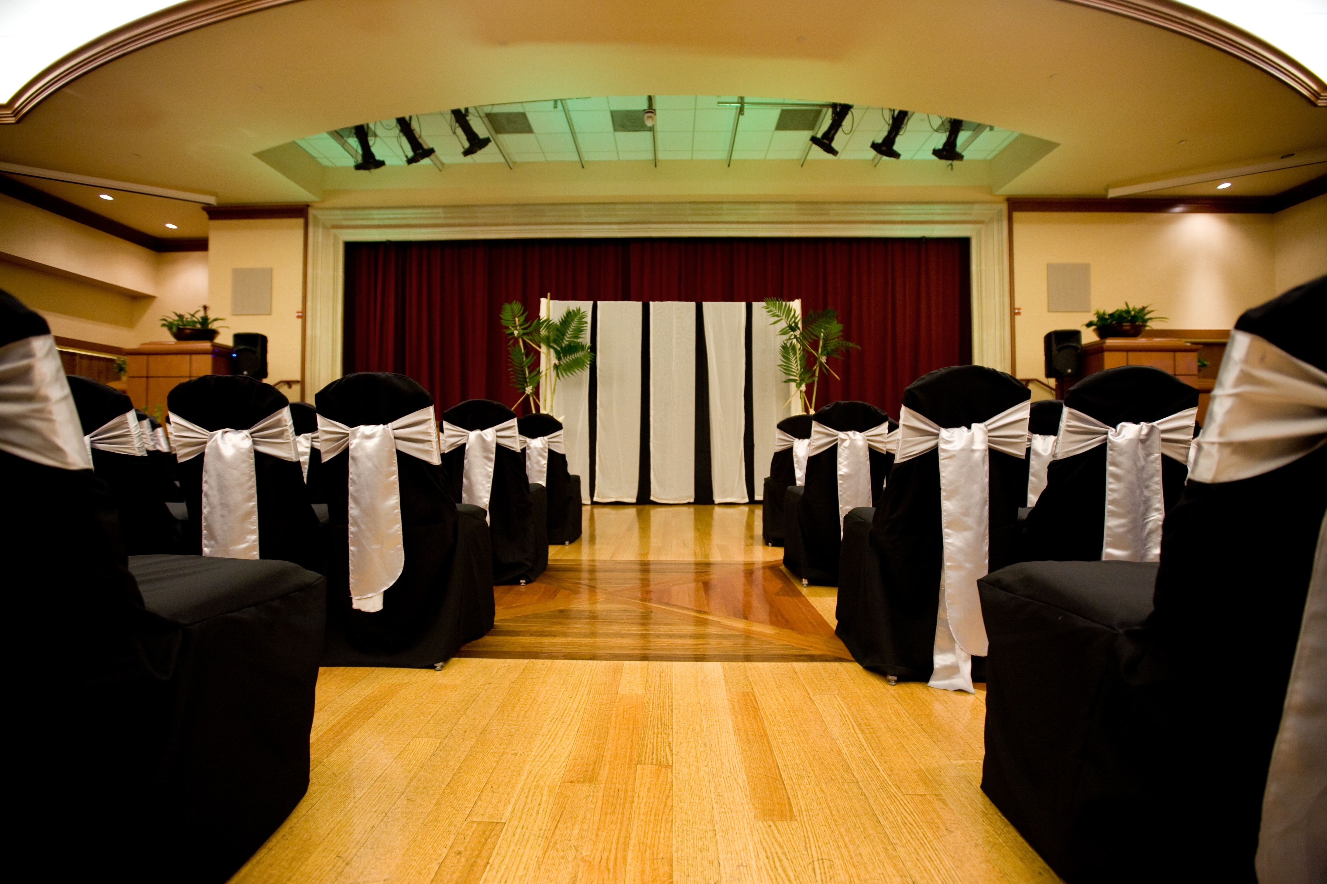 Following the cocktail hour, the guests enter the ballroom for a delicious dinner and dance party. There is a grand stage that can be utilized and works well if you have a band or to display the cake. A large section of the ballroom is wood flooring, so you have a natural dance floor. Directly off the ballroom is the Secret Garden patio, planted with greenery and covered with a wooden trellis and paddle fans. Another sweet water feature adds to the beauty of this tucked away space. This patio included in the ballroom rental and makes a perfect area for enjoying a nice evening, having a cigar bar, a s’mores station or adding some furniture for an outdoor lounge.