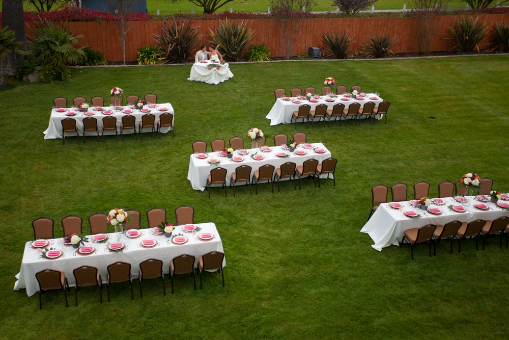 Another nice feature is the groom’s pool house “Man Cave” with a bar, TV for game night, and a couple of very comfy leather recliners (yes with cup holders!). The fellas can dress in this space prior to the ceremony, but during the event, guests can utilize this room to get away (catch that World Series!), or to enjoy a cold beer at the bar. For overlooking the entire venue, at palm tree height, is an awesome rooftop cabana, with comfy seating and umbrella table – it’s a perfect vantage point to spy on your friends below or for enjoying the cool breeze of the evening.