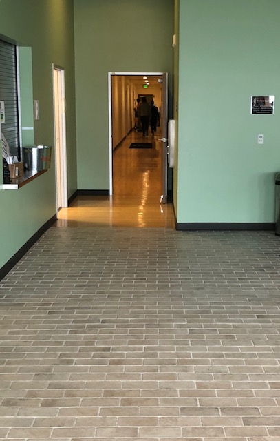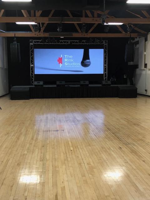 Moving into the primary event space… white-washed brick interior walls and an open wood-beamed ceiling create a blank canvas to dream up your wildest event, most formal gala, or fun wedding reception. The peaked-wood-beams are framed by a black ceiling backdrop and offers the ability to add a more formal element of chandeliers or your choice of overhead lighting. In-house lighting is included in the rental if you prefer to stick to what’s included. The large stage, 20ft x 10ft live streaming video wall, and audio capabilities will excite any musician, full band, or simply a lover of technology. You will find a way to incorporate this just for the wow factor! A roll-up side door gives architectural detail to the space, but is also very convenient for load-in of larger pieces plus rentals. The Rink Studios is fantastic for concert performances (can hold approx. 500), and the venue is super ideal for cocktail gatherings of up to 300, or for more formal seating of 200 guests. I’ve already mentioned the 1950’s roller skate rink hardwood floors, but this bears mentioning again!