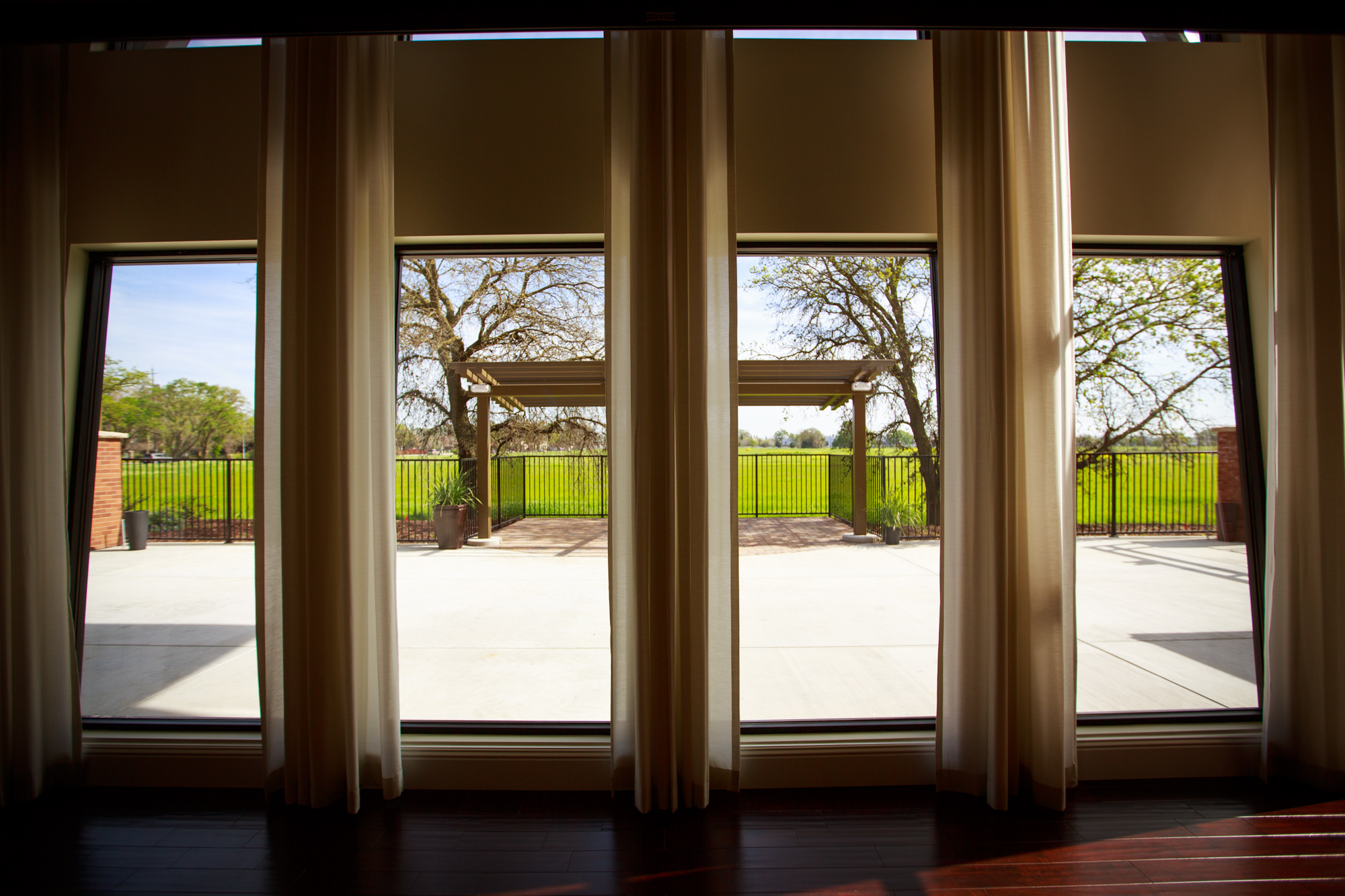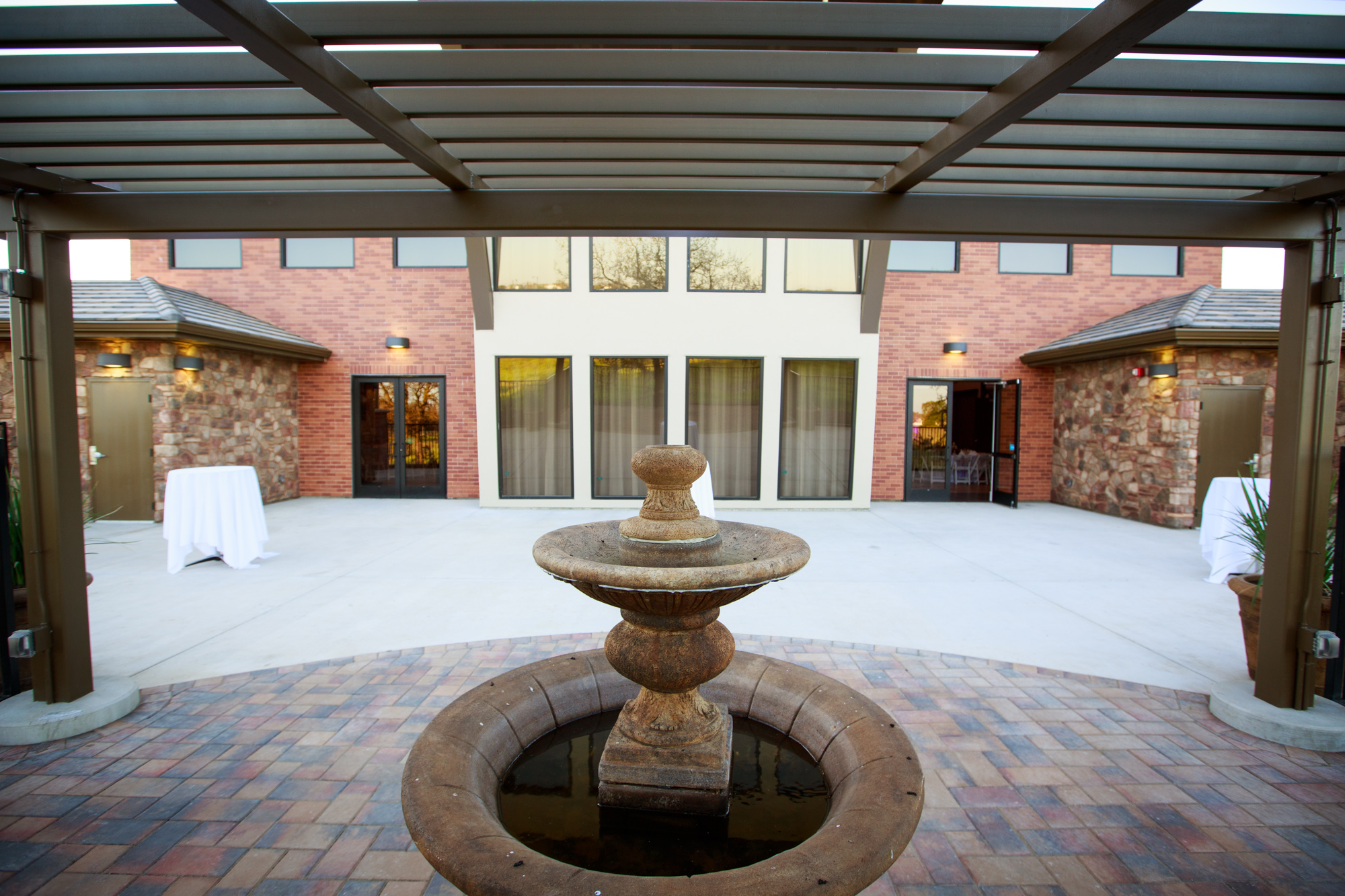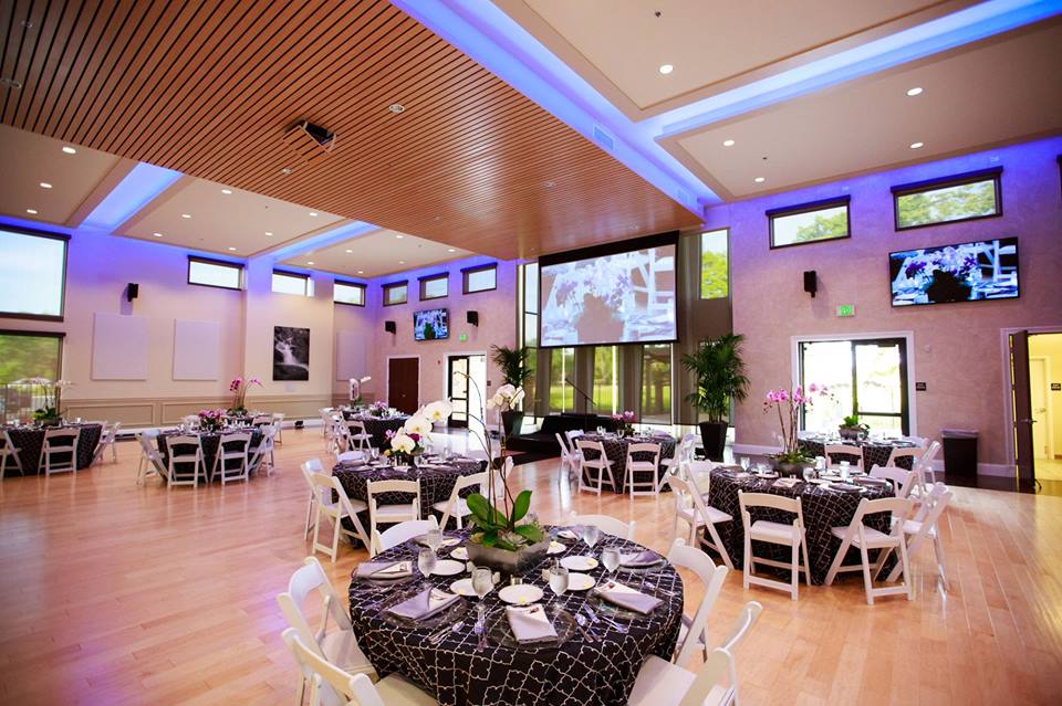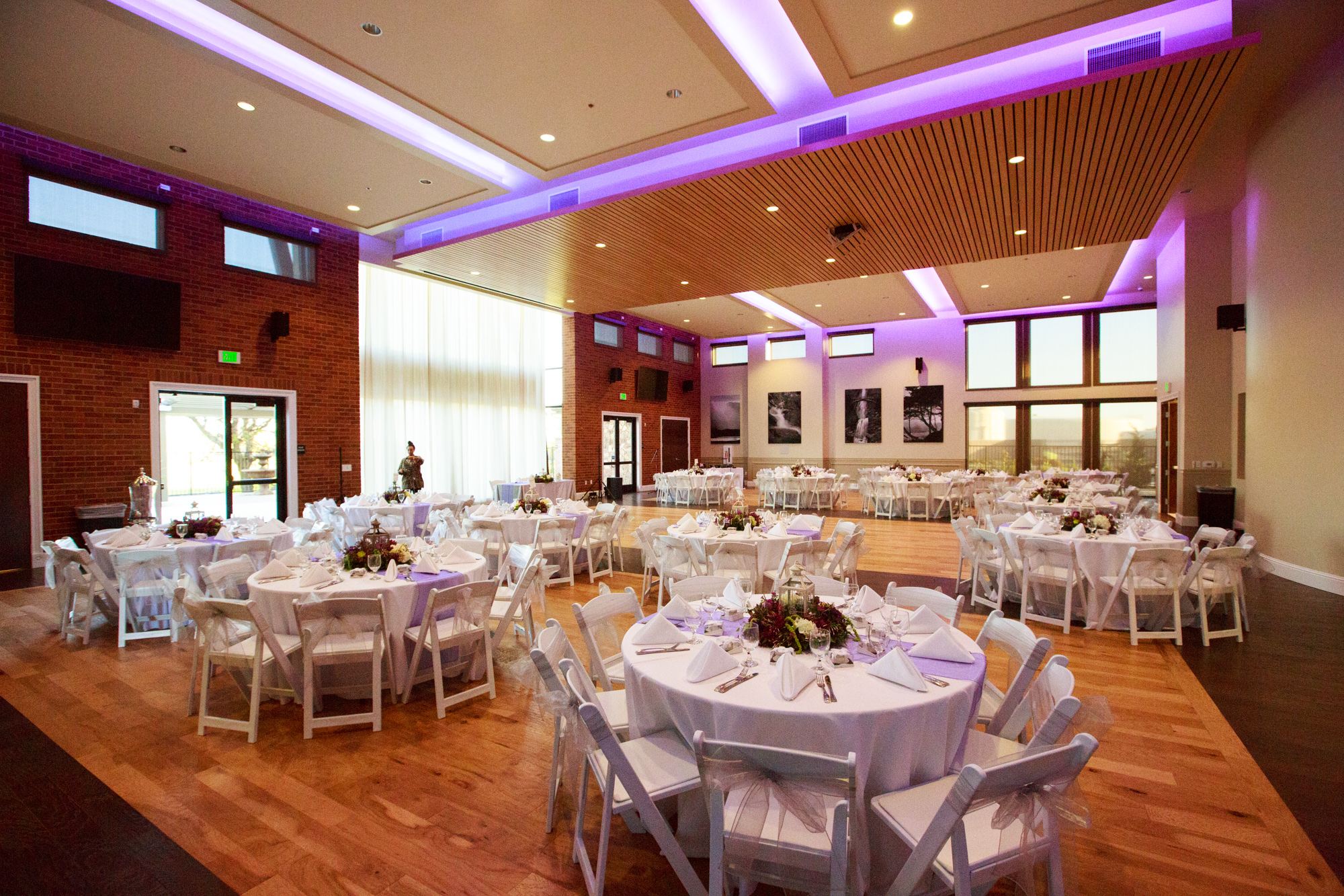 This state-of-the-art event center is like nothing in the Sacramento region. Located in Elk Grove, just south of Sacramento, in a little bit of countryside, two separate venues comprise The Falls Event Center. The exteriors of the buildings are very handsome having a combination of brick and stone with contemporary but simple lines giving the buildings a unique, modern look. The two buildings have identical foot prints and room layouts but have slightly different interior styles. If it is a wedding you are planning, the intimate courtyard would be a nice place for the ceremony and then move inside to the main ballroom space for the reception. The wood floors are two-toned with light and dark wood, the wall colors are neutral, warm and inviting. Alcoves are built in to the wall and there are lovely large, stately urns to adorn the curve and nitches. A projector is discreetly mounted in the lofty ceiling, complete with retractable screen and the ballrooms even have built in colored LED lights to give a fun and festive flair to any event.