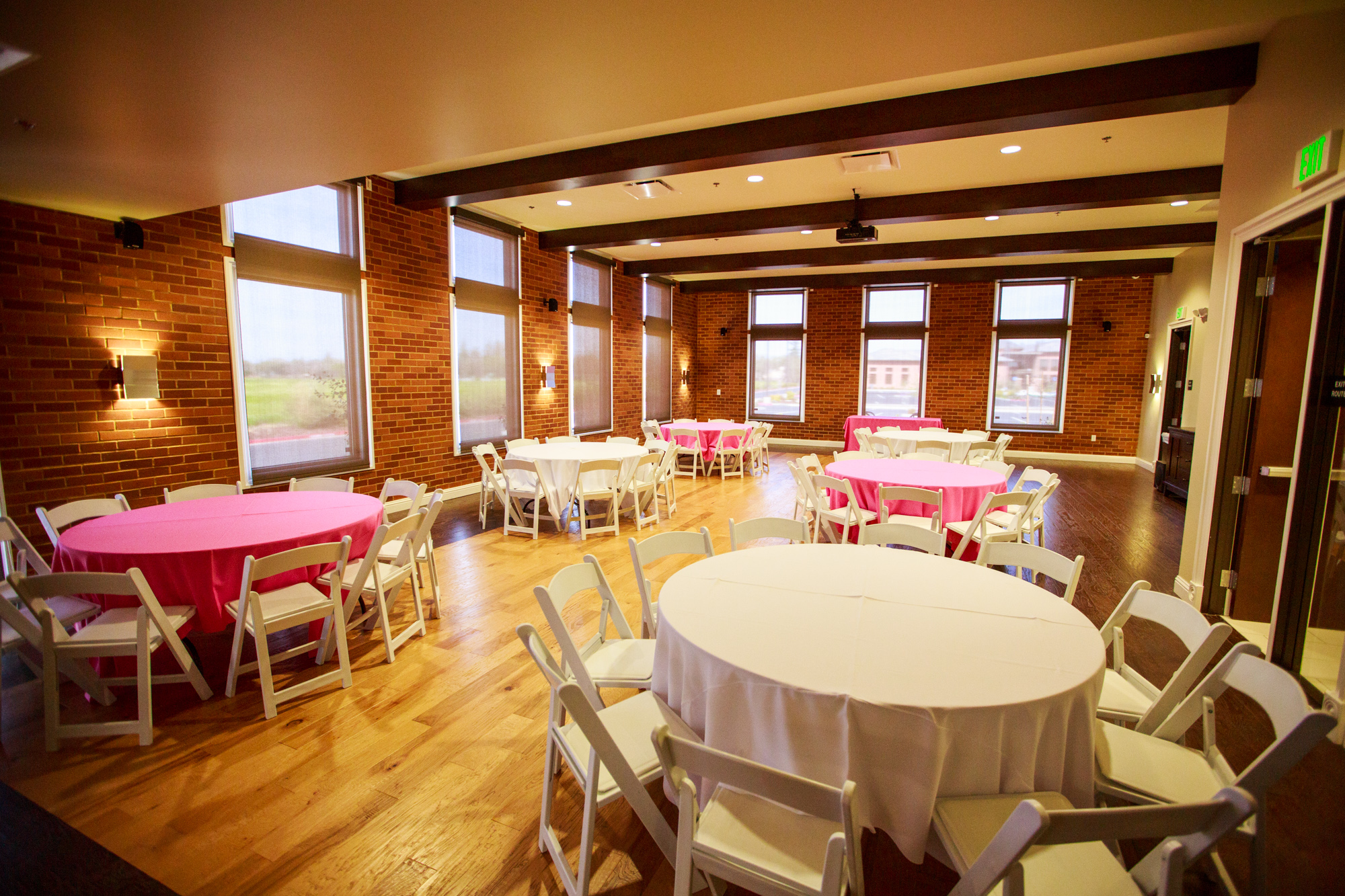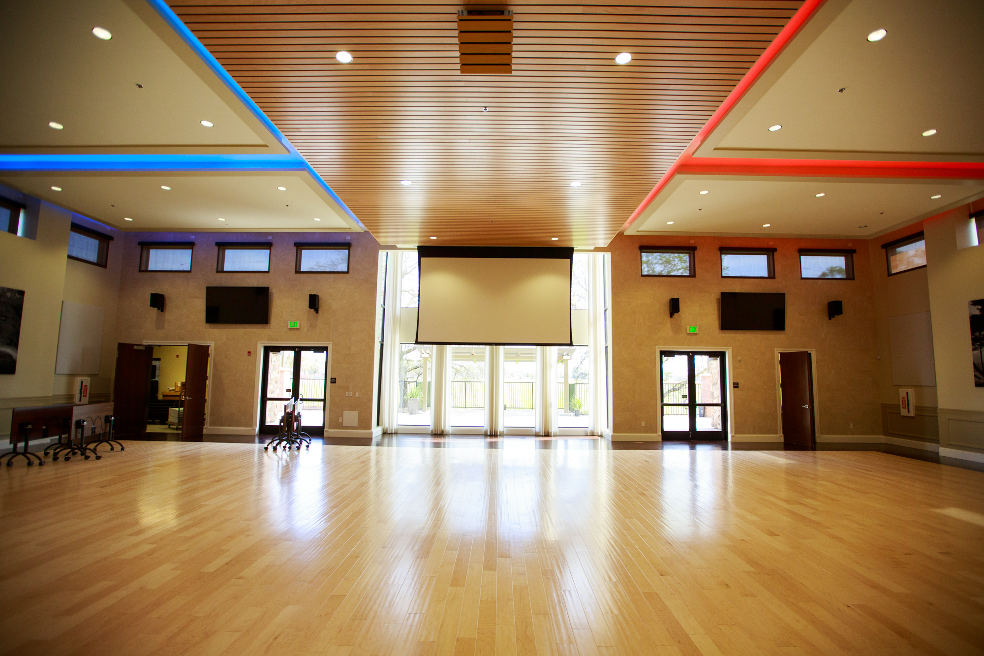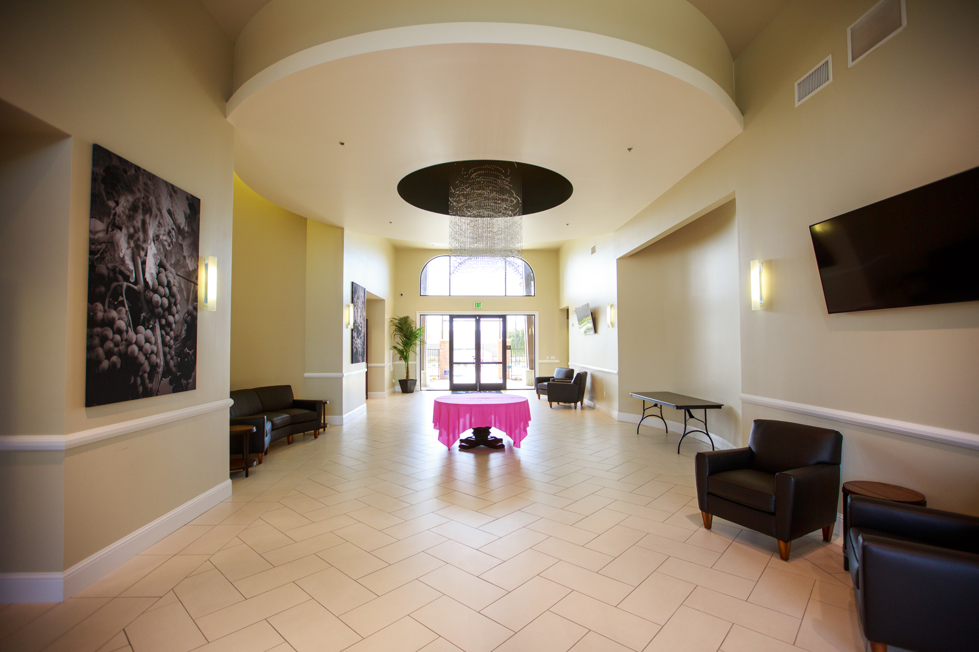 This state-of-the-art event center is like nothing in the Sacramento region. Located in Elk Grove, just south of Sacramento, in a little bit of countryside, two separate venues comprise The Falls Event Center. The exteriors of the buildings are very handsome having a combination of brick and stone with contemporary but simple lines giving the buildings a unique, modern look. The two buildings have identical foot prints and room layouts but have slightly different interior styles. If it is a wedding you are planning, the intimate courtyard would be a nice place for the ceremony and then move inside to the main ballroom space for the reception. The wood floors are two-toned with light and dark wood, the wall colors are neutral, warm and inviting. Alcoves are built in to the wall and there are lovely large, stately urns to adorn the curve and nitches. A projector is discreetly mounted in the lofty ceiling, complete with retractable screen and the ballrooms even have built in colored LED lights to give a fun and festive flair to any event.
