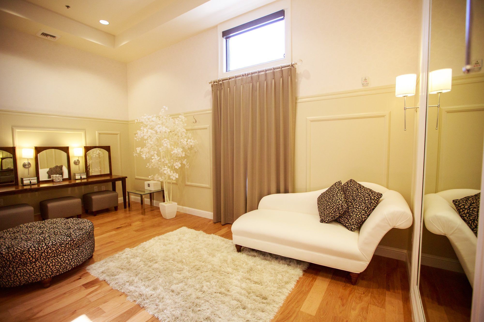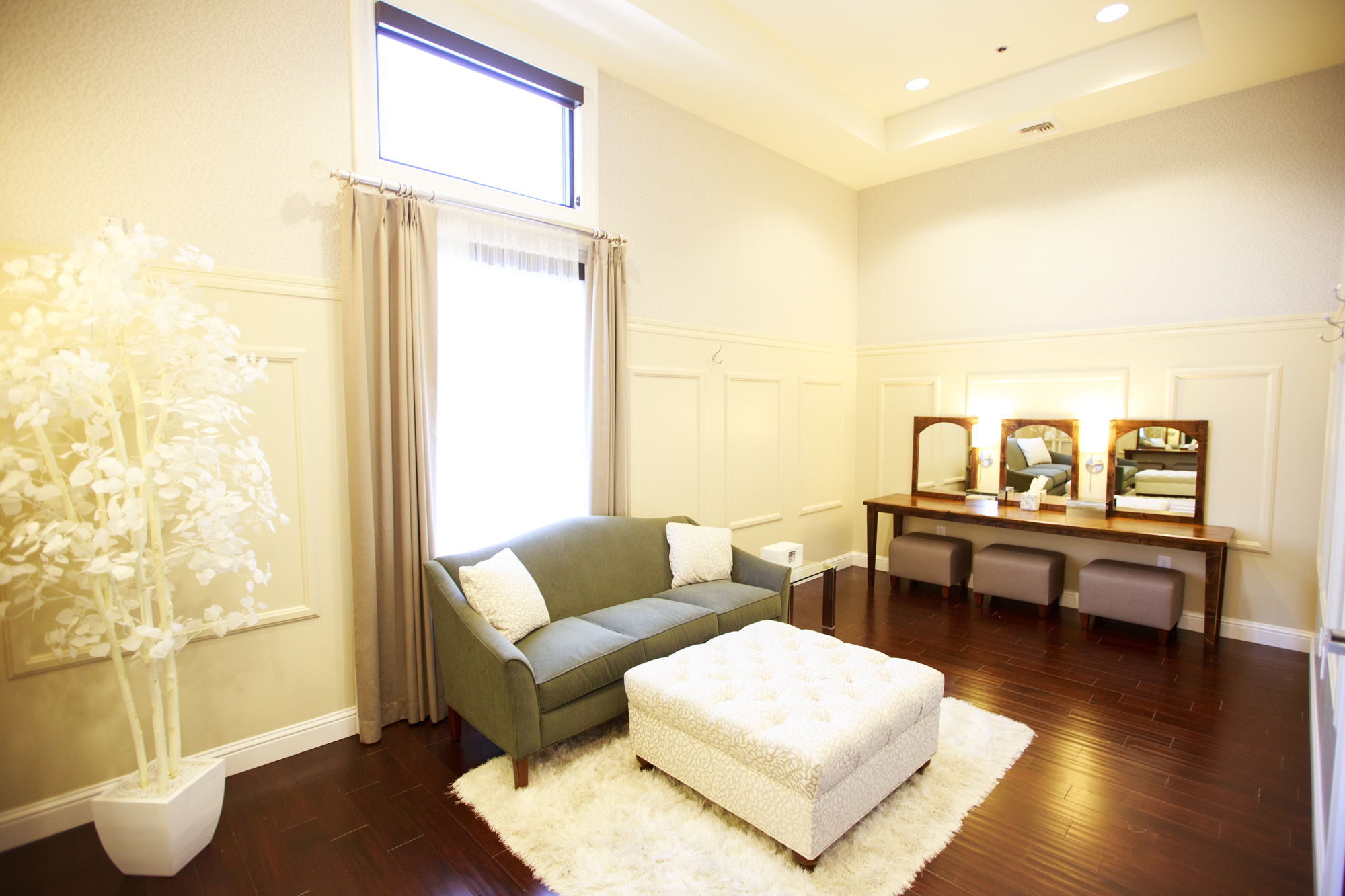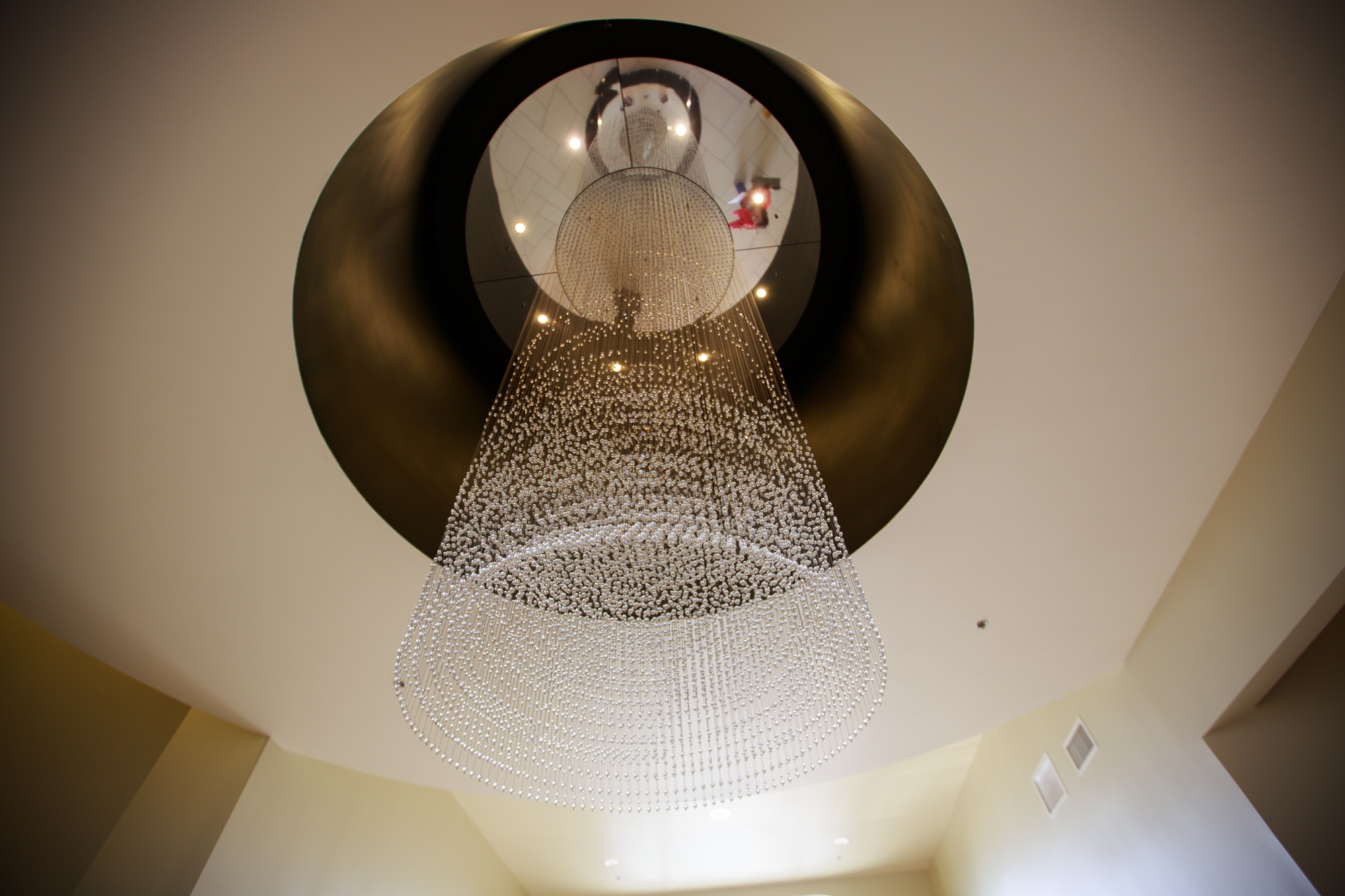 This venue seems to have countless, fantastic amenities throughout. All of the AV is included and is easily operated from an AV cabinet located in the room – free of charge. Can I just say wow! A lovely bridal changing lounge is nicely furnished with a sofa, 3-mirror dressing table, restroom and a full length mirror. They have thought of everything! Tables and chairs are included with the rental at The Falls. The foyer is a grand entrance being large and a nicely decorated space. A large table in the center of the room sits under a beautiful, modern “chandelier”. The large central light fixture is made up of 1,800 strands of delicate clear beads that are illuminated from above.