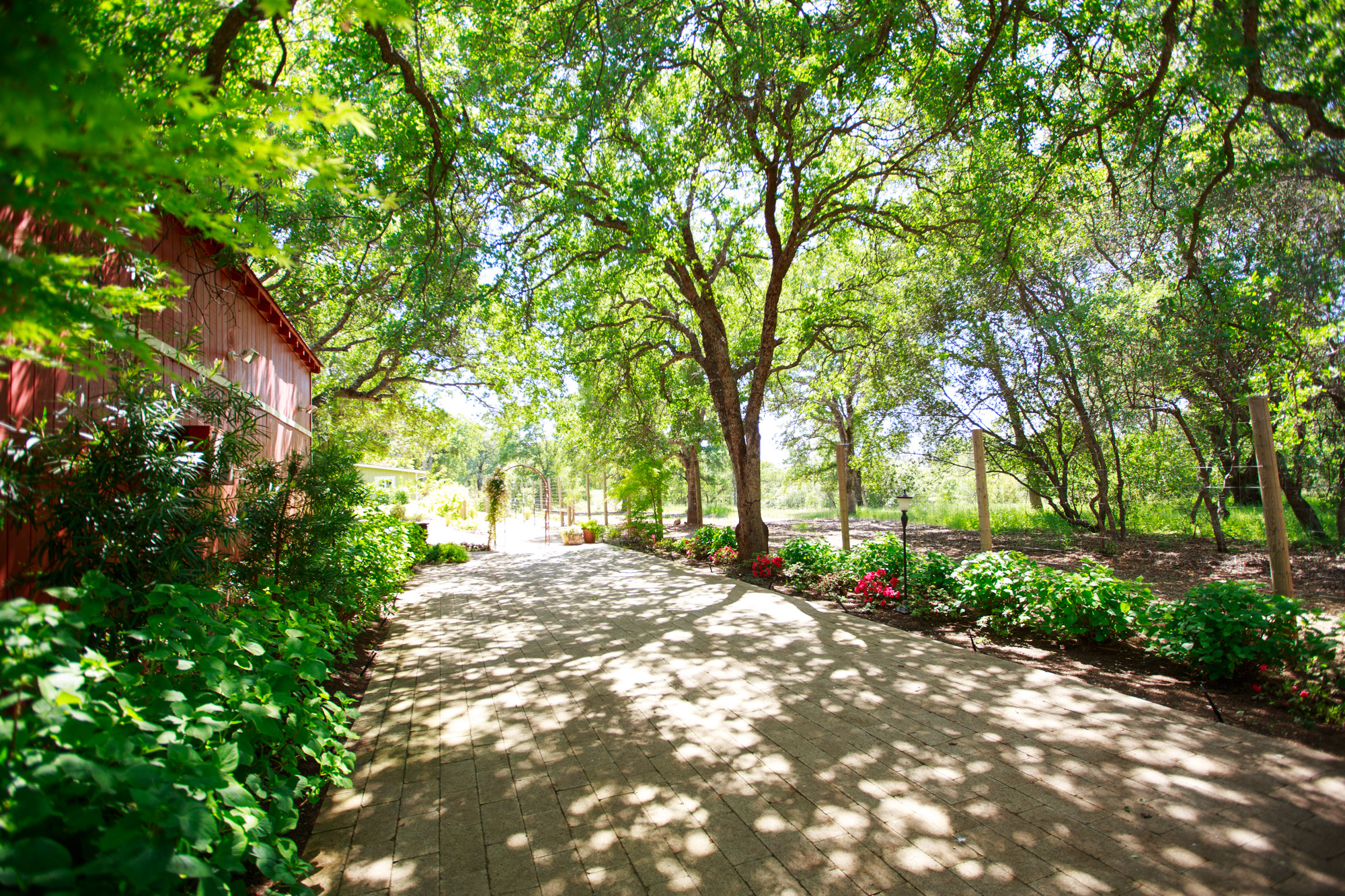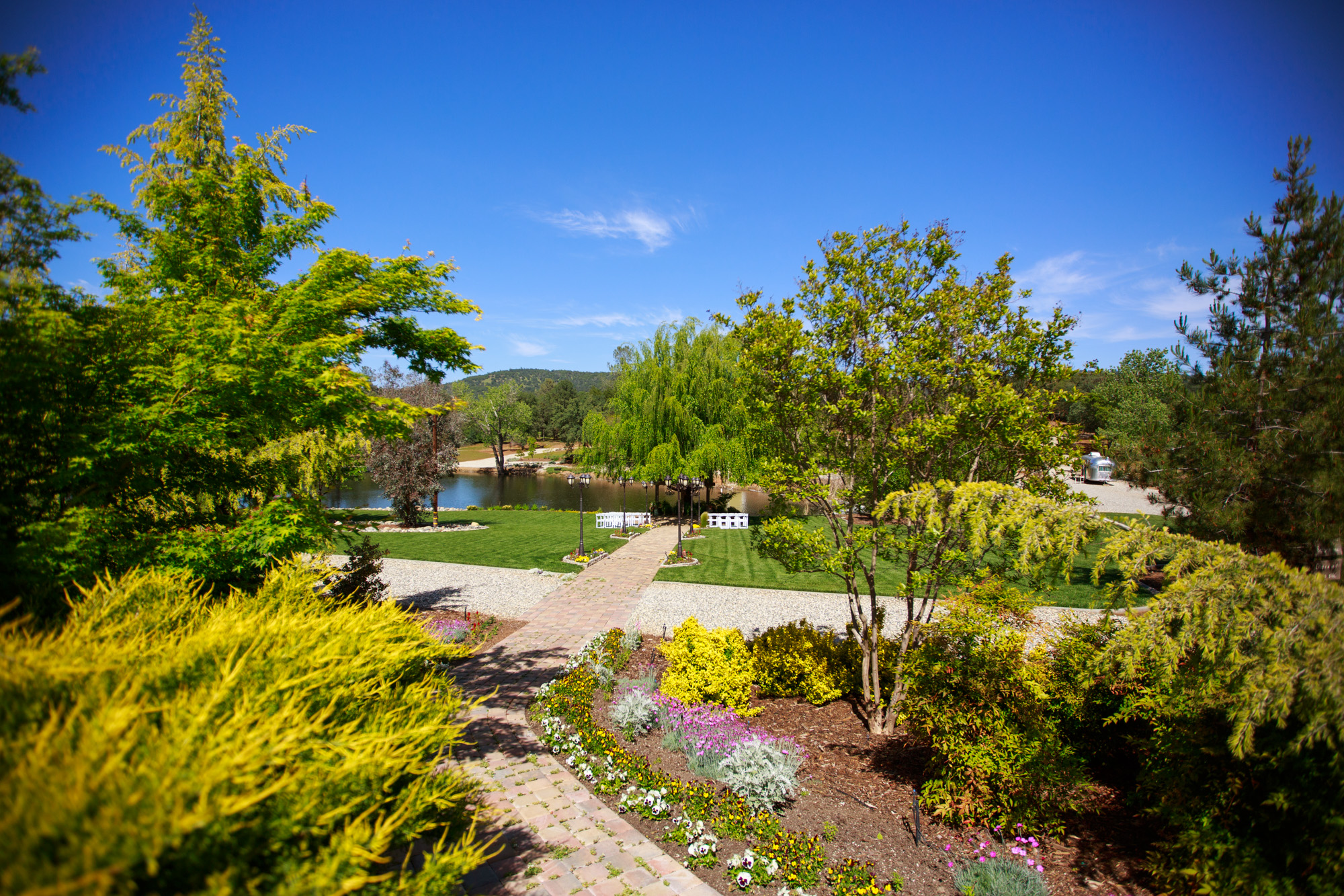 The Vixens enjoyed a Sunday drive in the California Gold Country foothills to stroll and absorb a lovely slice of country heaven. The Barns at Willow Creek are on 40 acres, near a little old community known as Brown’s Valley, not too far from Grass Valley and only 1 ½ hours from downtown Sacramento. After entering through a white-washed split rail fence, we followed a meandering pathway through oaks and landscaped gardens across to another pathway, lined with pretty bedding plants, which lead to a fantastic lush lawn that surrounded a large serene pond. Picnics can be held on this lawn but we saw it set up for the most idyllic wedding ceremony location. A pair of intricate crystal chandeliers have been hung under a pond side willow tree, fastened to pecky cedar beams that frame the couple. Guests can witness the nuptials while gazing at all the country serenity.