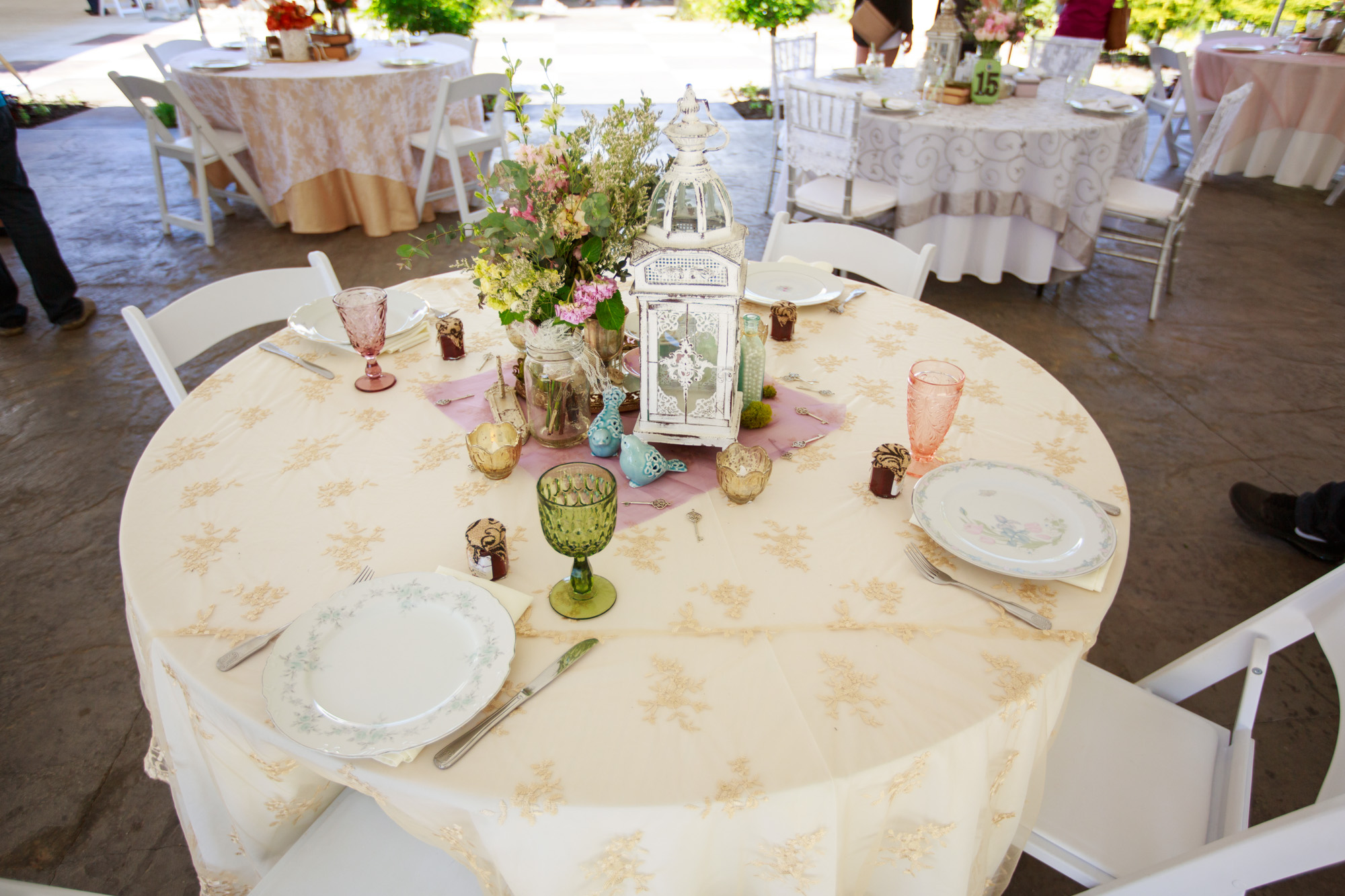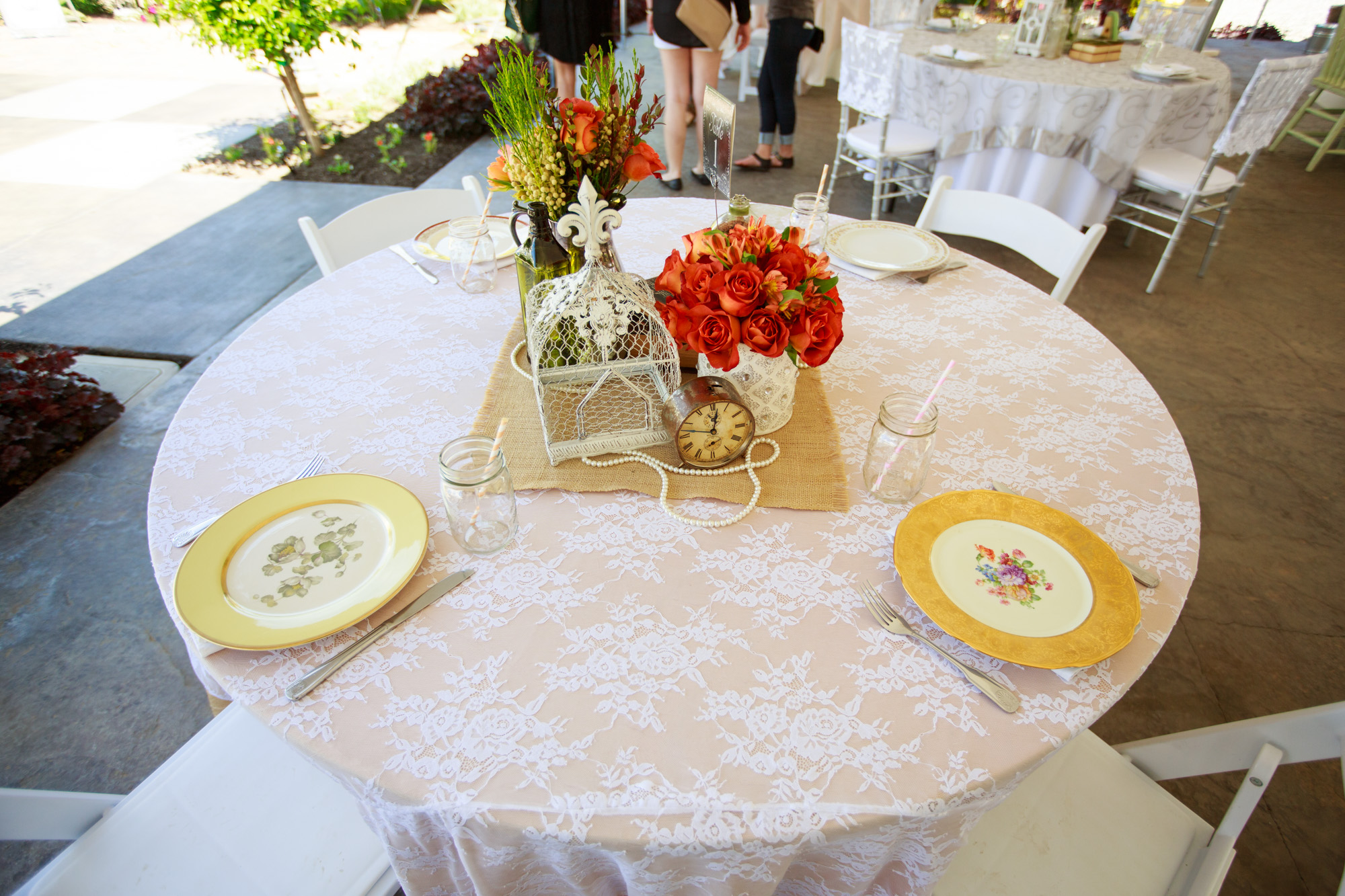 Barns at Willow Creek has the largest collection of vintage décor we’ve ever seen. From large pieces such as dressers, chandeliers, armoires, old doors and beautiful mirrors, on down to detailed smaller pieces that make up interesting, unique table centerpieces. They have all kinds of fascinating collectibles to create a vignette display… and actually very little florals would be needed. They also have tables, chairs and linens (in different colors and styles) plus awesome mis-matched vintage china – and (for an ungraded price) beautiful wooden farm tables and mis-matched chairs. It’s all right there for you!
